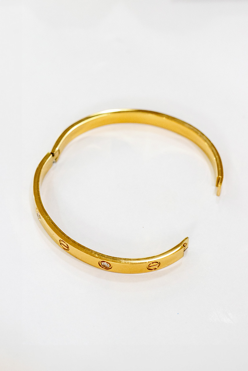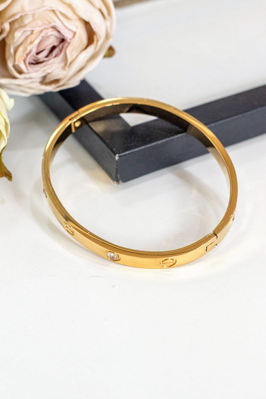 Μεταλλική ατσάλινη βέργα με διακοσμητικά στράς σε χρυσή απόχρωση. Συνδυάζεται εύκολα και με άλλα κοσμήματα για ένα εντυπωσιακό look.