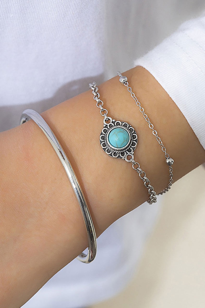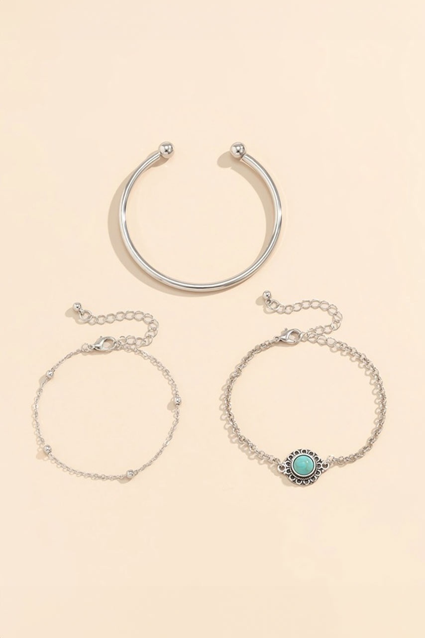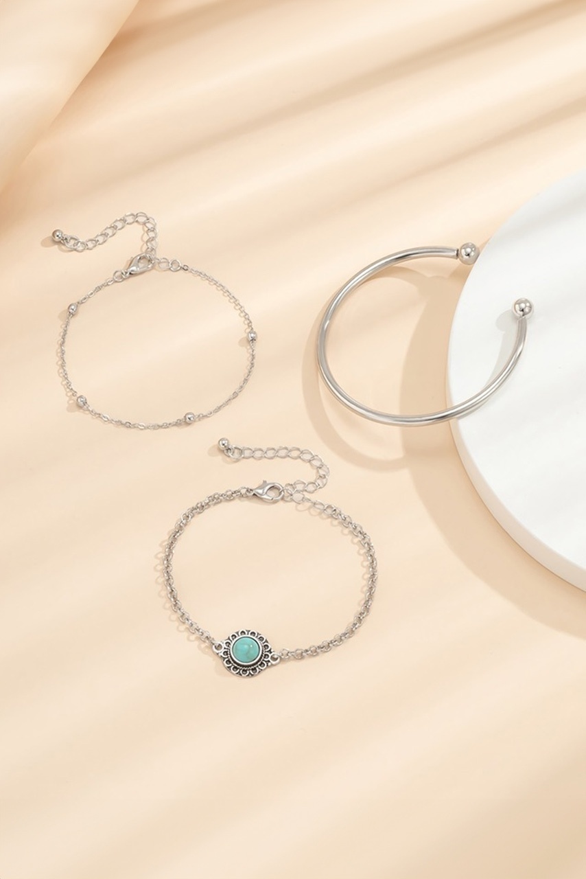 Σετ 3 βραχιόλια σε ασημί απόχρωση με turquoise πέτρα σε retro στυλ, έχει κούμπωμα και αλυσίδα επέκτασης για να ταιριάζει σε όλα τα μεγέθη.