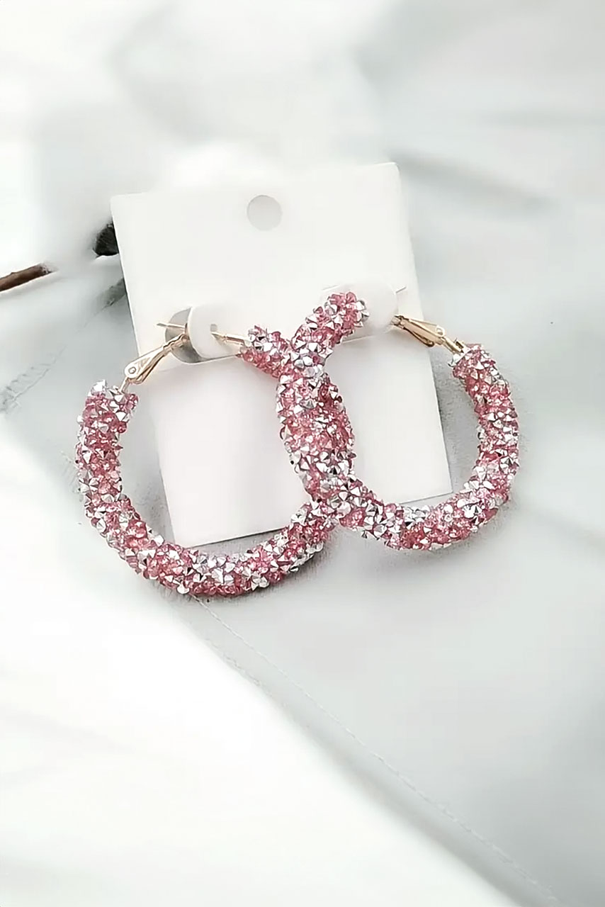 Σκουλαρίκια ροζ κρίκοι με πέτρες στρας περιμετρικά.