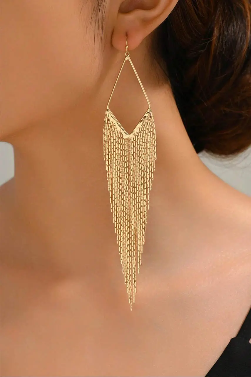 Statement σκουλαρίκια με χρυσές αλυσίδες – Glam tassel design, για εμφανίσεις που δεν περνούν απαρατήρητες. Το γεωμετρικό πλαίσιο σε σχήμα ρόμβου αγκαλιάζει διακριτικά το αυτί, ενώ οι χρυσές αλυσίδες δημιουργούν ένα dramatic waterfall αποτέλεσμα που κινείται με κάθε σου βήμα. Το απόλυτο statement αξεσουάρ για βραδινά looks, red carpet vibes και party-ready σύνολα. Styling Tip: Συνδύασέ τα με στράπλες φόρεμα, sleek ponytail ή ανοιχτό ντεκολτέ για να κλέψουν την παράσταση.