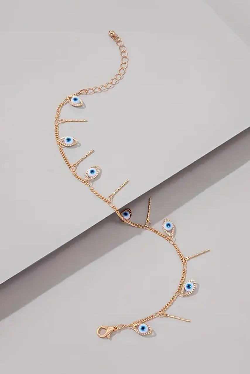 Εντυπωσιάστε με αυτή τη διακριτικά εντυπωσιακή αλυσίδα ποδιού, που συνδυάζει χρυσή μεταλλική αλυσίδα με blue evil eye charms για ένα κομψό και ταυτόχρονα συμβολικό look. Τα λεπτεπίλεπτα κρεμαστά στοιχεία προσδίδουν κίνηση και στιλ, ενώ το ματάκι προσθέτει μια αίσθηση προστασίας με fashion twist. Ιδανική για καθημερινά city looks αλλά και βραδινές καλοκαιρινές εξόδους δίπλα στη θάλασσα.