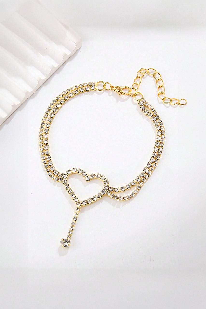 Αν θέλεις να δώσεις μια glam νότα στα καλοκαιρινά σου looks, αυτή η αλυσίδα ποδιού είναι το απόλυτο must-have! Με elegant σχέδιο σε χρυσό τόνο και διακριτικές πέτρες στρας, αγκαλιάζει τον αστράγαλο με διπλή γραμμή και ξεχωρίζει χάρη στη λαμπερή καρδιά στο κέντρο. Η λεπτομέρεια με το κάθετο κρεμαστό στοιχείο προσθέτει κίνηση και λάμψη με κάθε σου βήμα. Ιδανική για να φορεθεί ξυπόλυτη στην παραλία, πάνω από σανδάλια ή ακόμη και σε βραδινές εξόδους με mini φόρεμα και γυμνά πόδια.