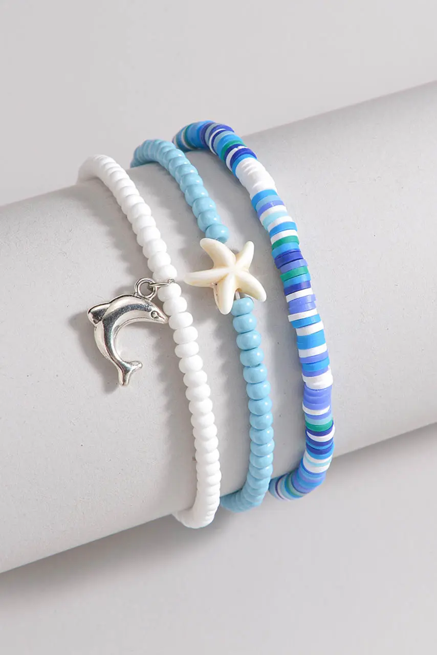 Dolphin Starfish σετ βραχιόλι ποδιού. Φόρεσέ το και άφησε τα καλοκαιρινά vibes να σε ταξιδέψουν. Το σετ περιλαμβάνει τρία βραχιόλια ποδιού με πολύχρωμες χάντρες, charm σε σχήμα αστερία και μεταλλικό δελφίνι, δημιουργώντας ένα playful και ταυτόχρονα κομψό layered αποτέλεσμα.