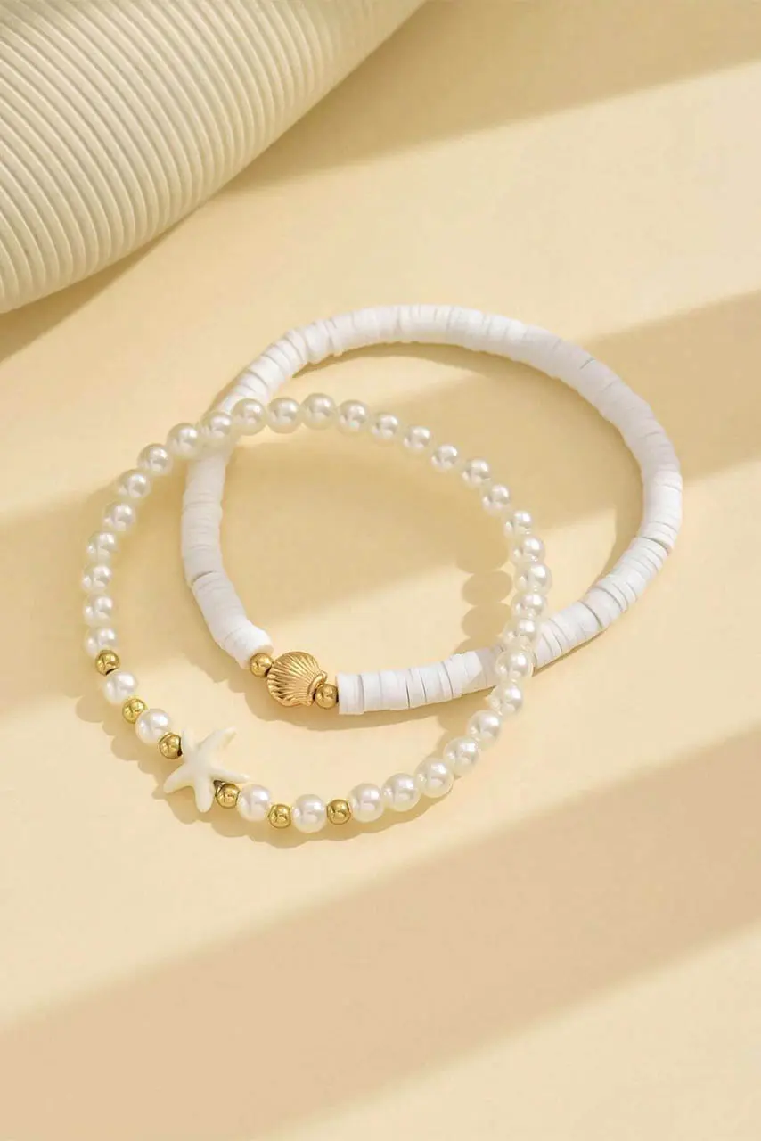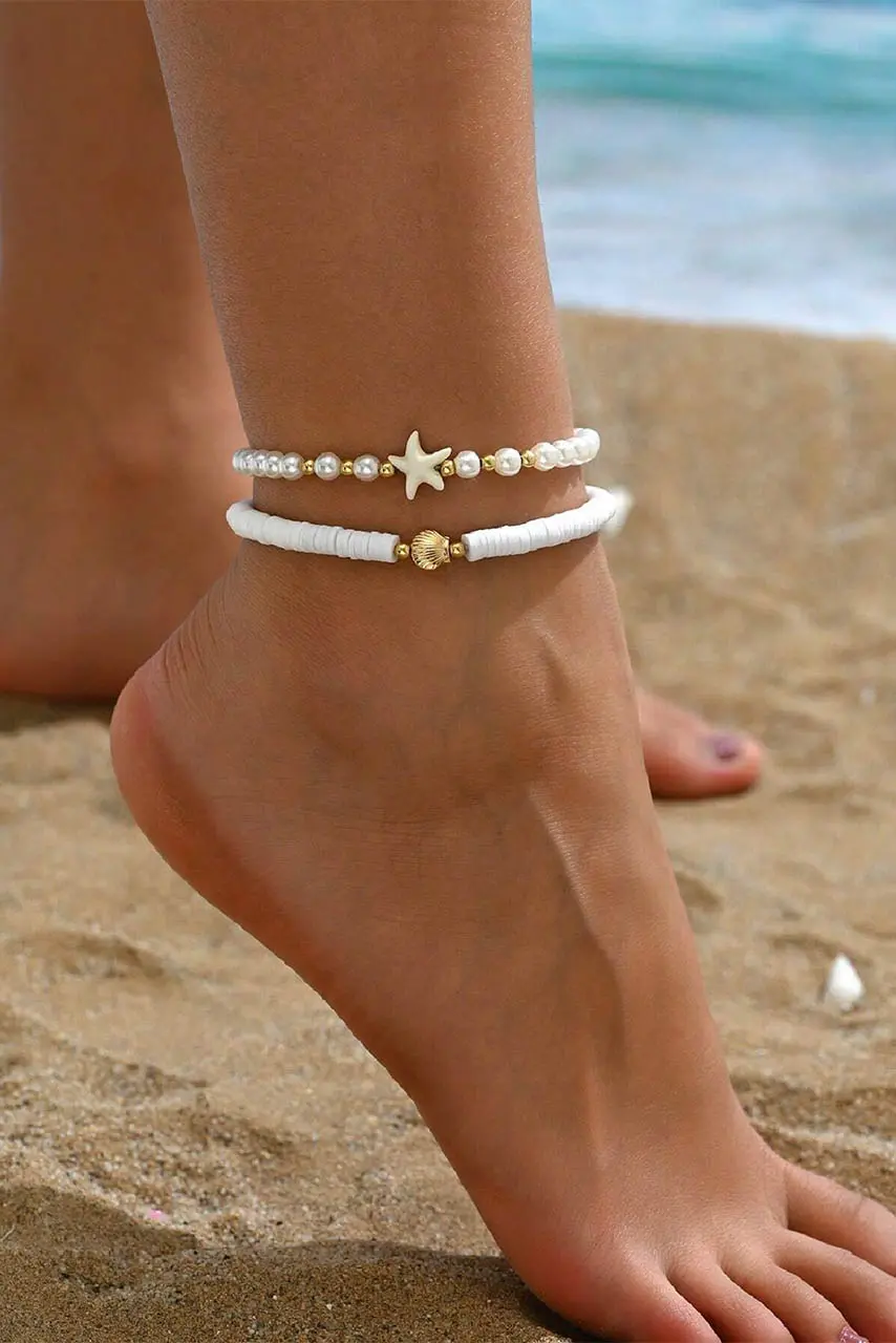 • Λεπτομέρειες: Διπλή αλυσίδα ποδιού με λευκές πέρλες, polymer beads, αστερία & χρυσό κοχύλι