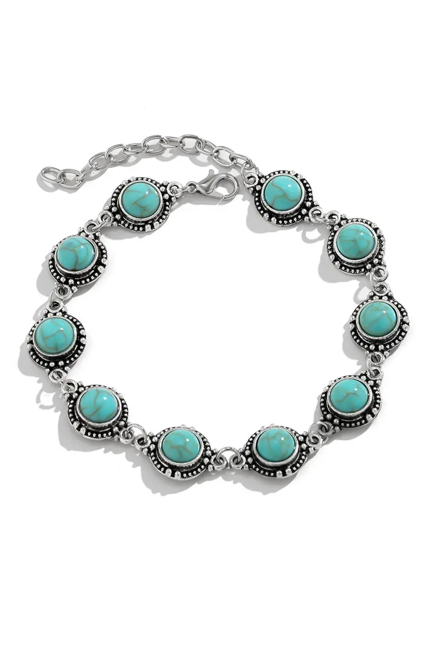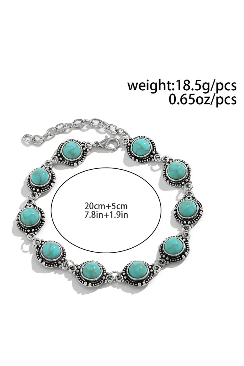 Ασημένια boho αλυσίδα ποδιού με τιρκουάζ πέτρες, ένα κόσμημα που ακροβατεί ανάμεσα στην αισθητική του bohemian chic και την αύρα των αιγαιοπελαγίτικων καλοκαιριών. Με λεπτοδουλεμένα στοιχεία σε ανάγλυφο ασημί φινίρισμα και κυκλικές τιρκουάζ πέτρες που αποπνέουν έναν αέρα vintage πολυτέλειας, αυτή η αλυσίδα ποδιού υπόσχεται να απογειώσει κάθε καλοκαιρινό outfit.