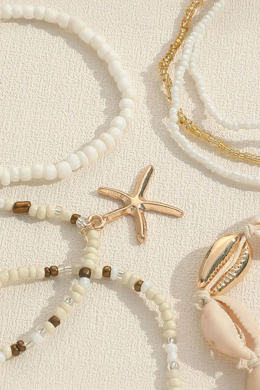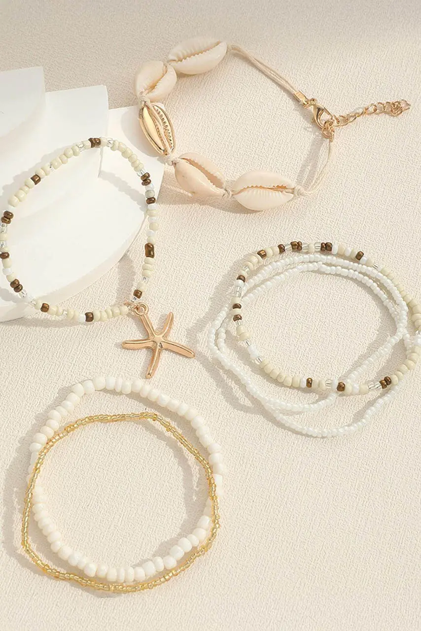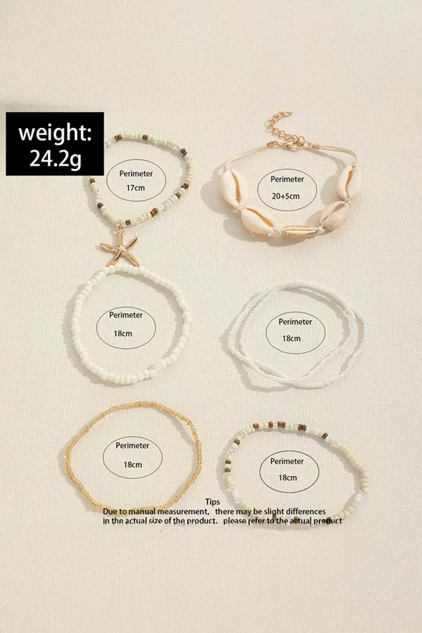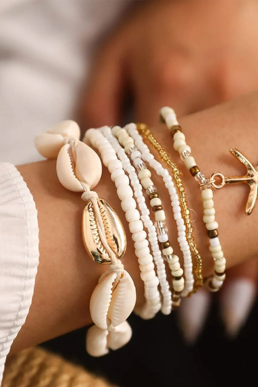 • Περιλαμβάνει: 7 βραχιόλια με κοχύλια, αστερία, λευκές & χρυσές χάντρες