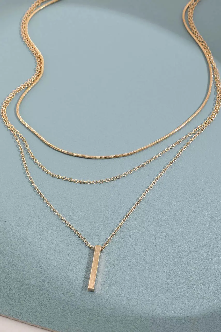 Χρυσό layered Bar κολιέ. Το απόλυτο κόσμημα για κάθε γυναίκα που αγαπά το less is more. Το layered αυτό κολιέ με τις τρεις διαφορετικές αλυσίδες και το διαχρονικό bar μοτίφ, ισορροπεί ανάμεσα στην κομψότητα και τη μοντέρνα απλότητα. Το κάθετο στοιχείο bar χαρίζει sleek χαρακτήρα και elongating effect στο ντεκολτέ, ενώ οι λεπτές αλυσίδες προσθέτουν διακριτική λάμψη και αίσθηση πολυτέλειας.