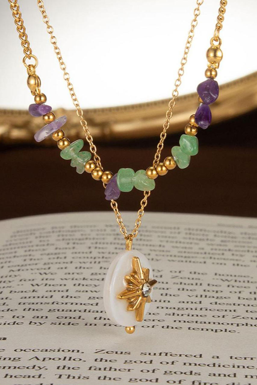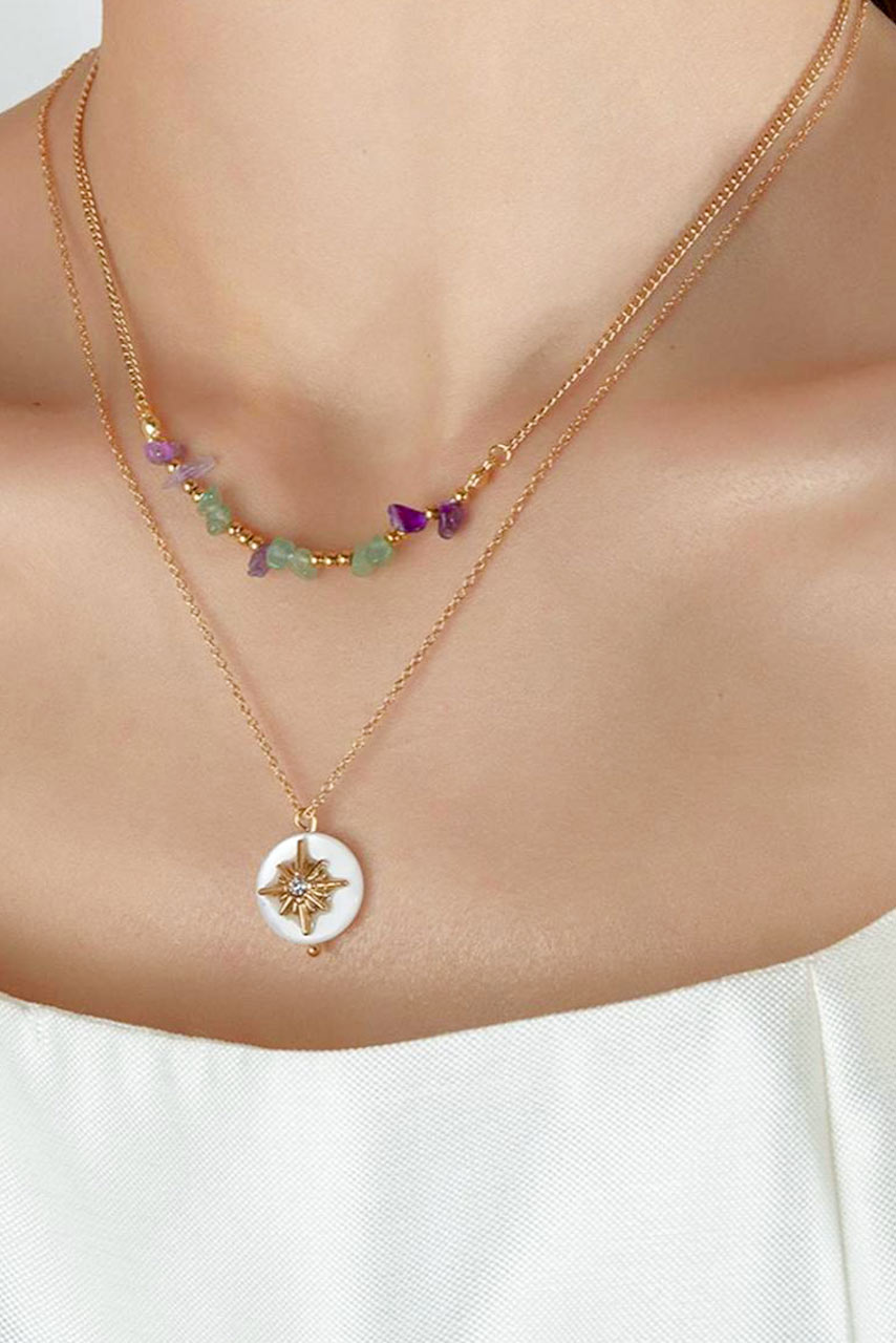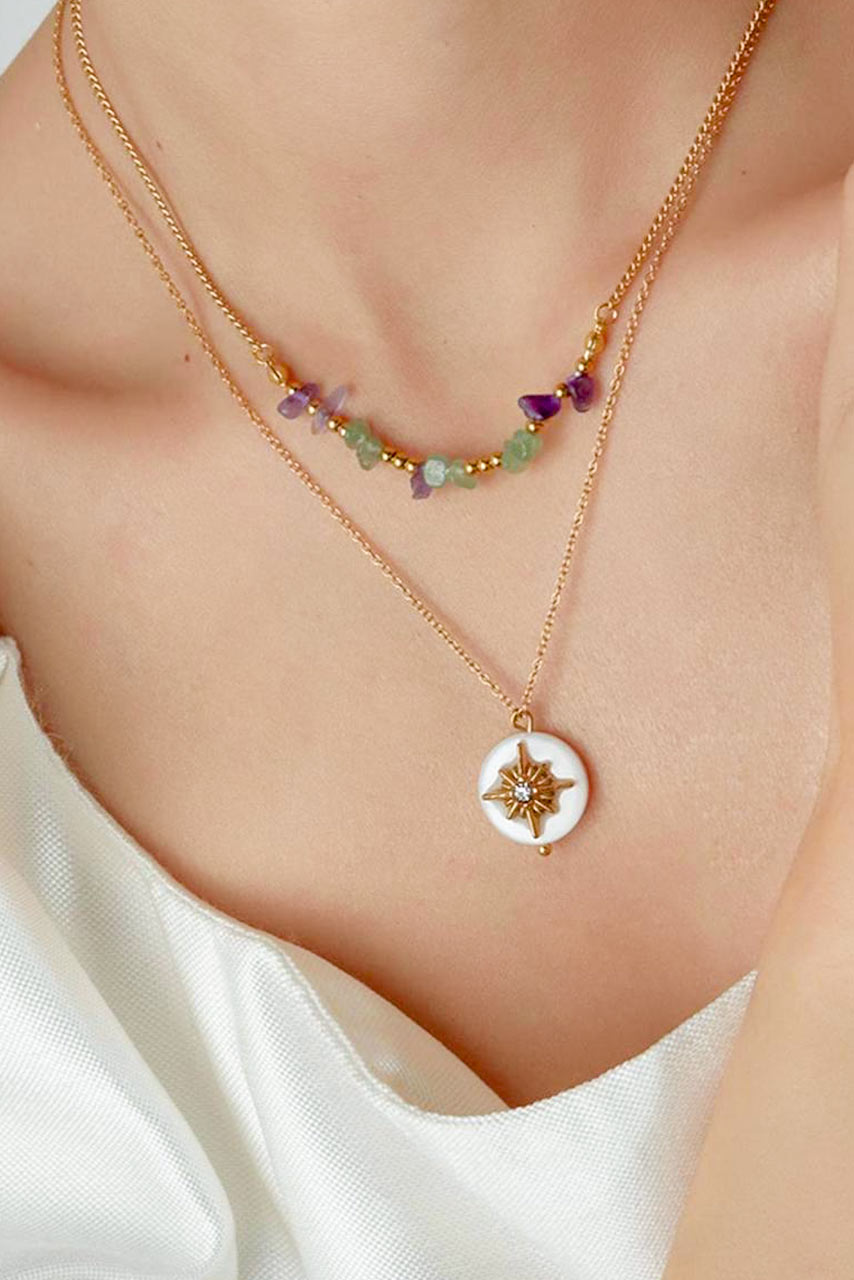 Διπλό ατσάλινο κολιέ  σε χρυσή απόχρωση με πετρούλες και το αστέρι του βορρά.