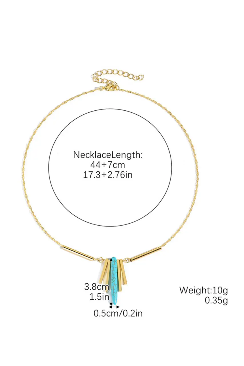 Golden & τιρκουάζ κολιέ με μπάρες. Ένα tribal-chic κολιέ που φέρνει μαζί του τη δύναμη της γεωμετρίας και τη φρεσκάδα του καλοκαιριού. Οι κάθετες χρυσές μπάρες ενώνονται αρμονικά με το κεντρικό τιρκουάζ στοιχείο, δημιουργώντας ένα εκλεπτυσμένο contrast που αιχμαλωτίζει το βλέμμα.