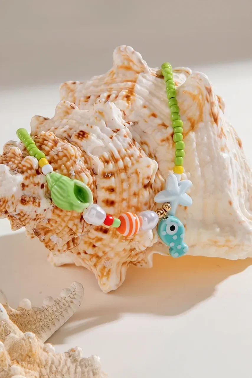 Βάλε καλοκαιρινή διάθεση σε κάθε σου look με αυτό το playful κολιέ με πράσινες χάντρες και μοναδικά διακοσμητικά charms! Ο συνδυασμός από fun σχέδια – ψαράκι, αστερίας, κοχύλι και πολύχρωμες λεπτομέρειες – χαρίζει boho και νησιώτικο χαρακτήρα, ιδανικό για beachwear εμφανίσεις αλλά και καθημερινά summer outfits. Οι χάντρες του προσθέτουν φρεσκάδα και χρώμα, ενώ το χρυσό μεταλλικό κούμπωμα με την επέκταση εξασφαλίζει άνετη εφαρμογή.