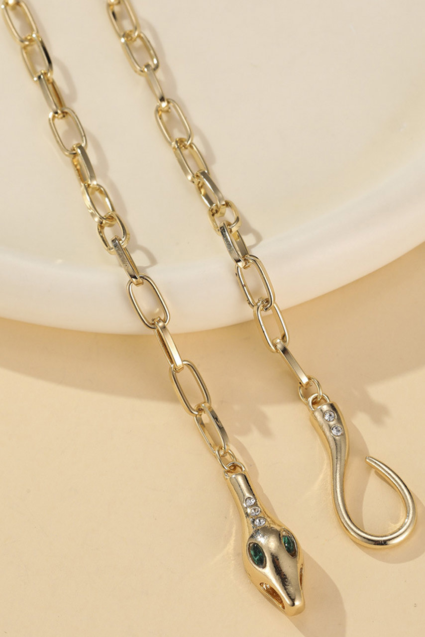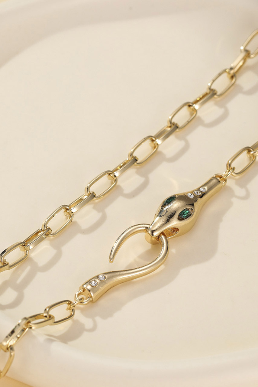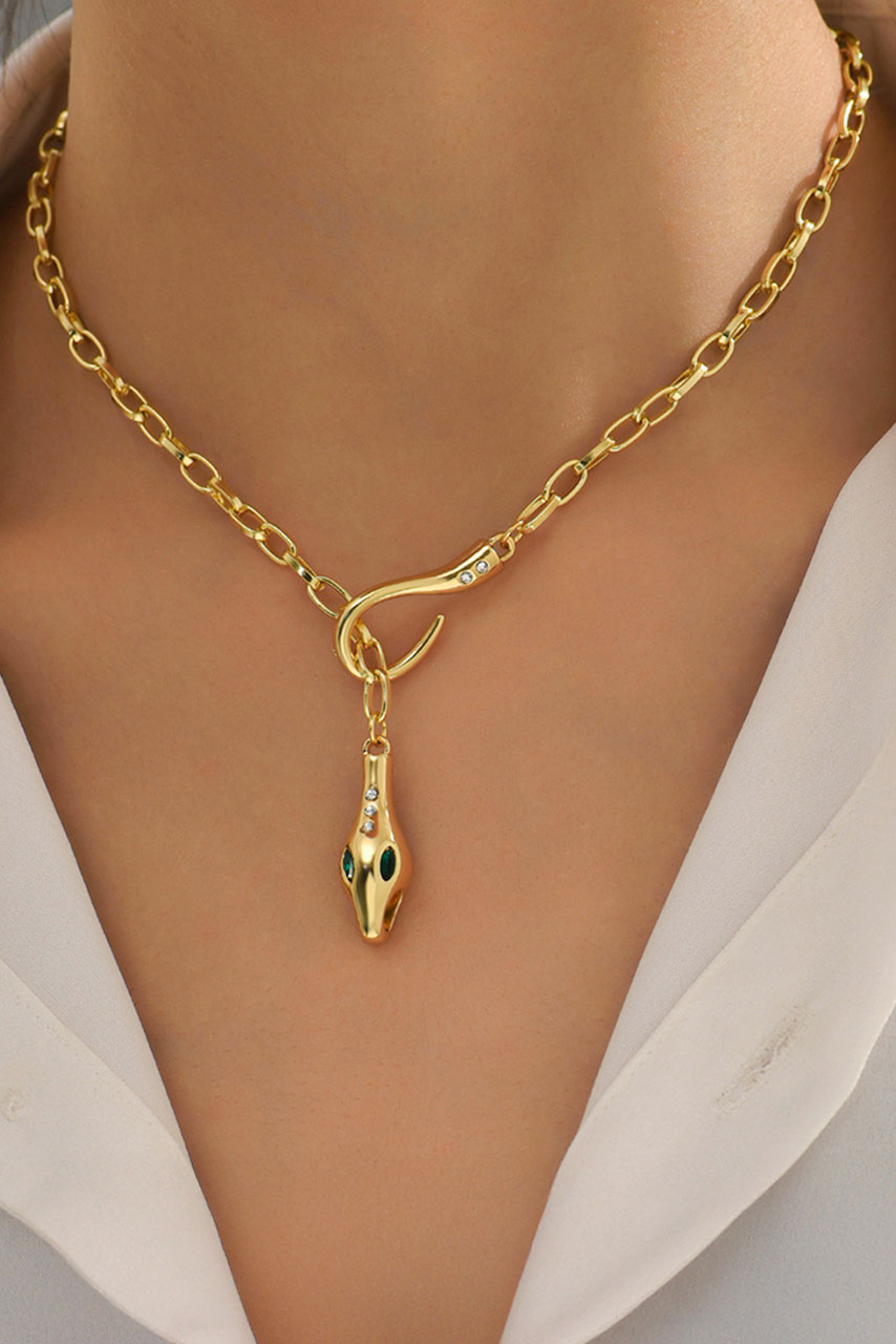 Κολιέ με σχέδιο φίδι σε χρύση απόχρωση και με λεπτομέρειες απο πράσινες μικρές πέτρες.