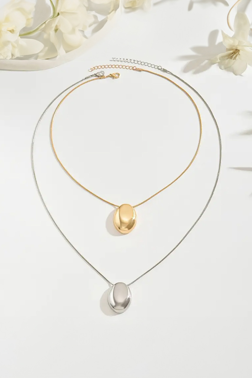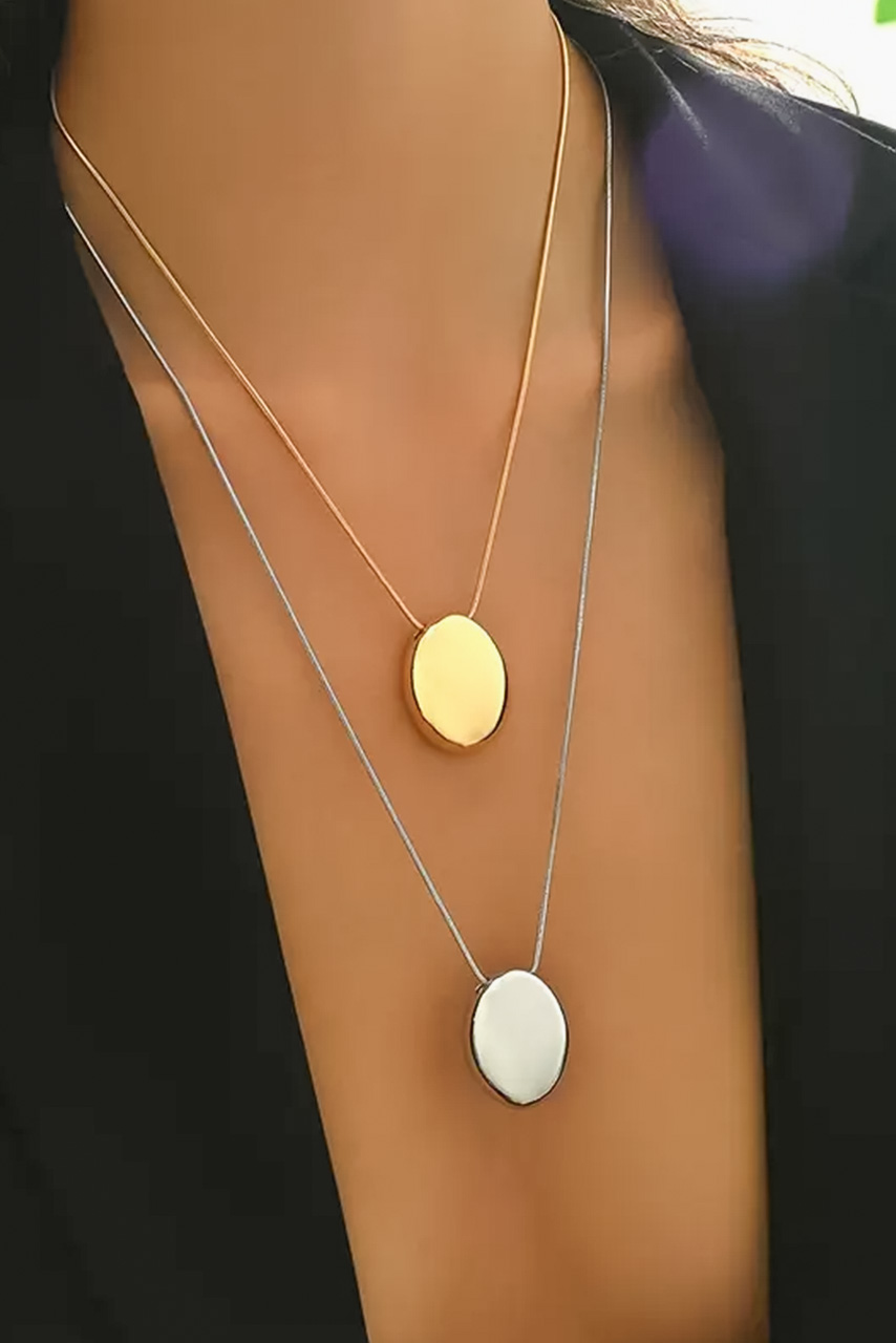 Απογειώστε το στυλ σας με αυτό το κομψό διπλό κολιέ, που συνδυάζει μια minimal αισθητική με μοντέρνο design. Διαθέτει δύο αλυσίδες σε διαφορετικά μήκη, η μία σε χρυσό τόνο και η άλλη σε ασημί, δημιουργώντας ένα εντυπωσιακό layering εφέ. Τα μεταλλικά μενταγιόν σε οβάλ σχήμα προσθέτουν μια διακριτική λάμψη και διαχρονική κομψότητα.