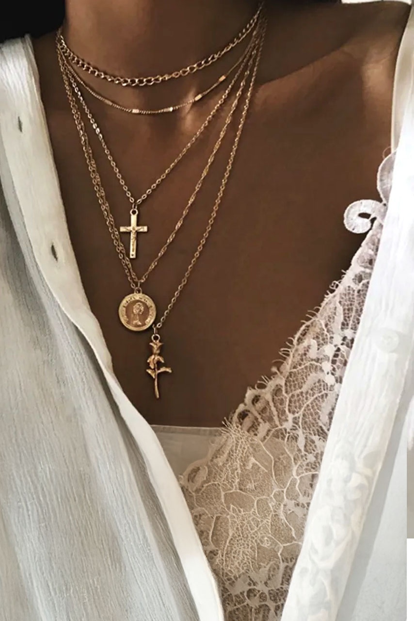 Layered κολιέ με μεταλλικά στοιχεία για boho chic εμφανίσεις.