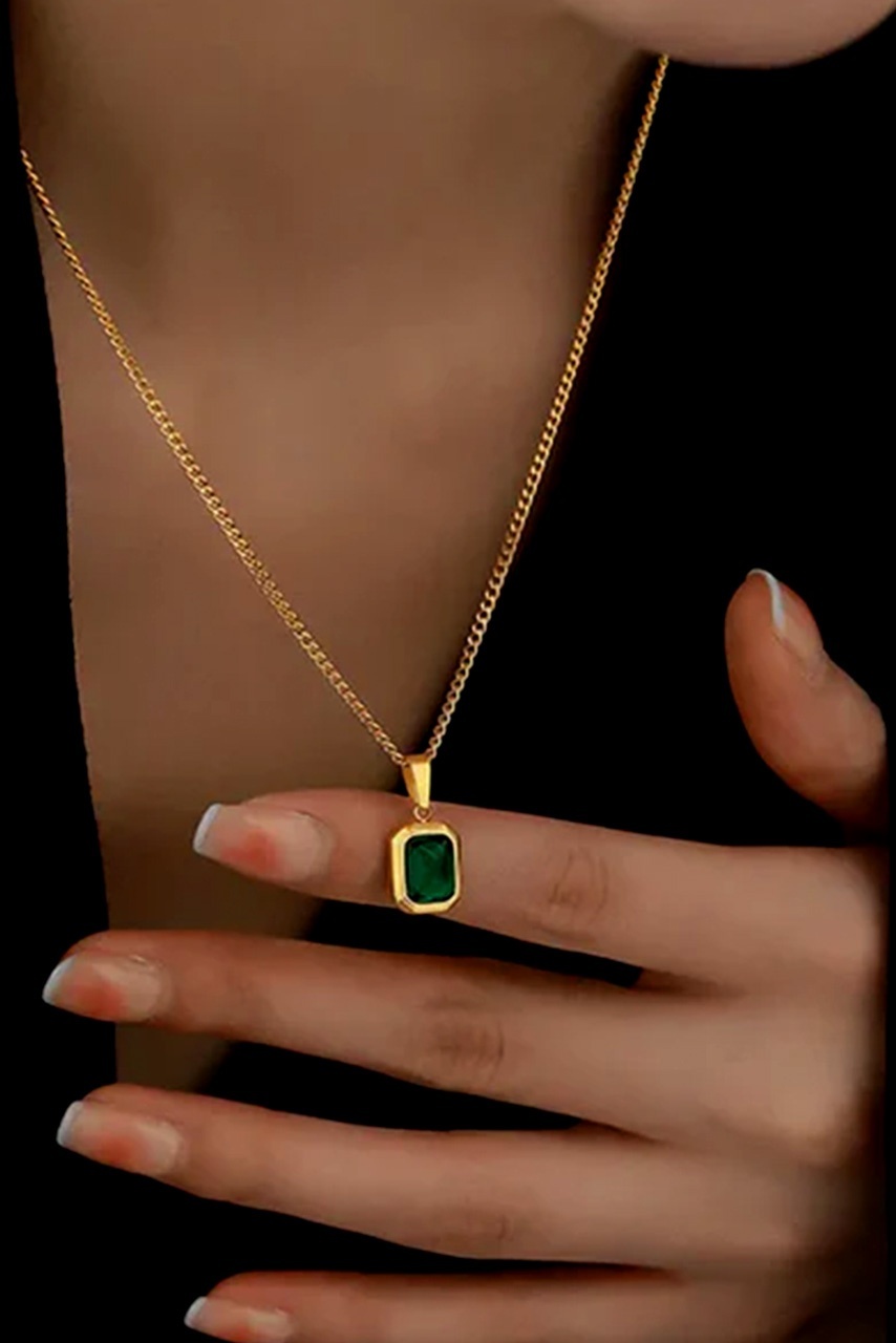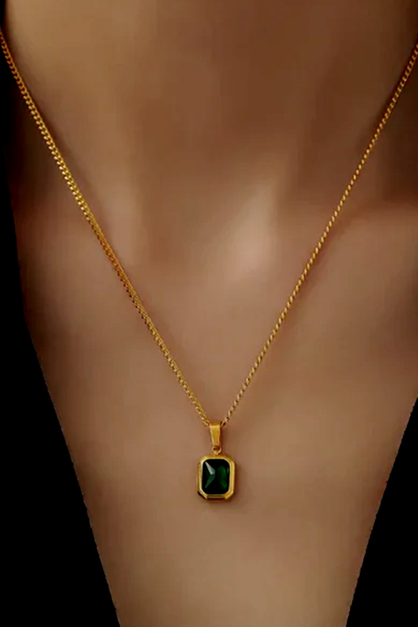 Κολιέ κρεμαστό ατσάλινο σε χρυσή απόχρωση με κρεμαστή πράσινη πέτρα.