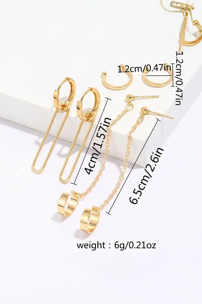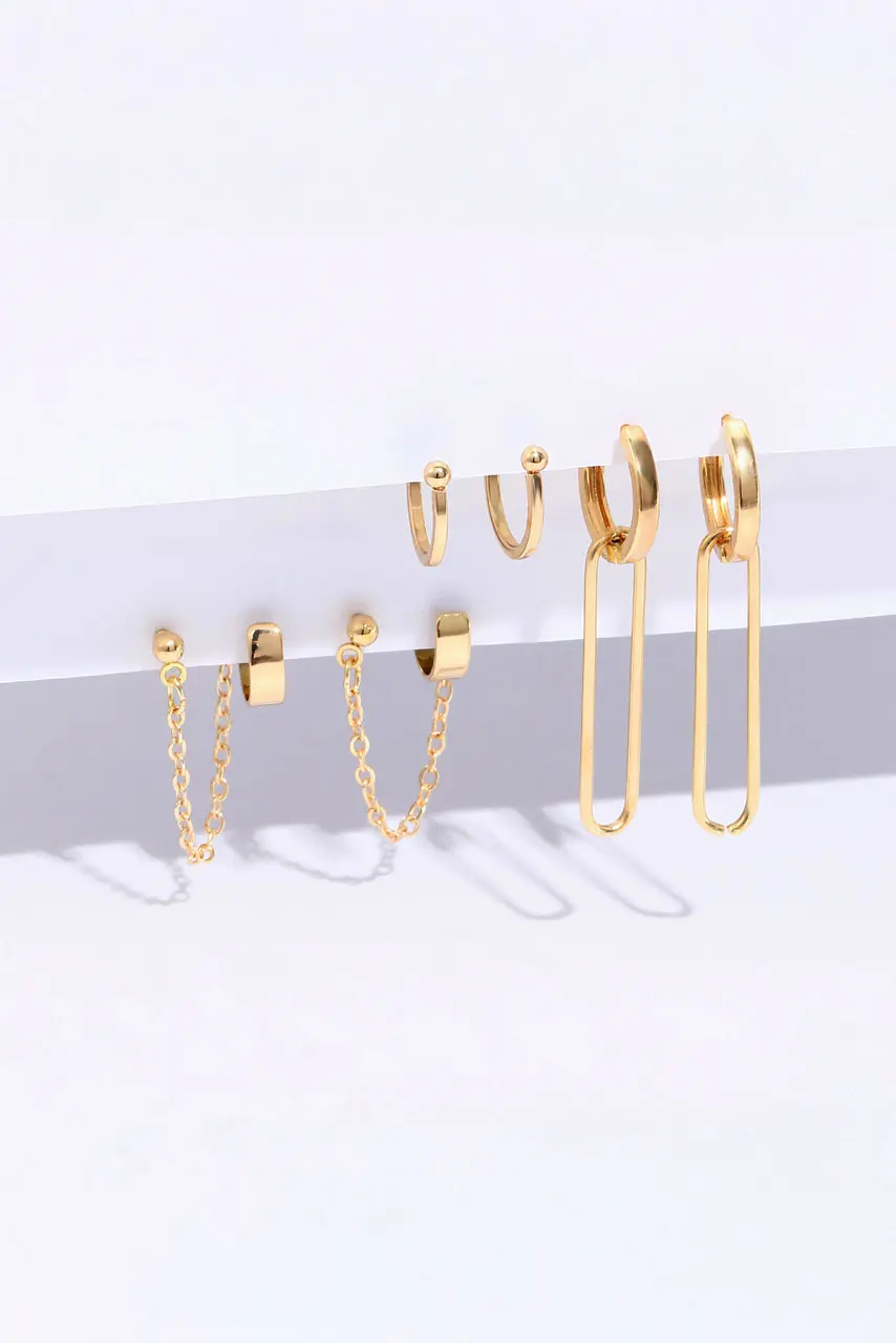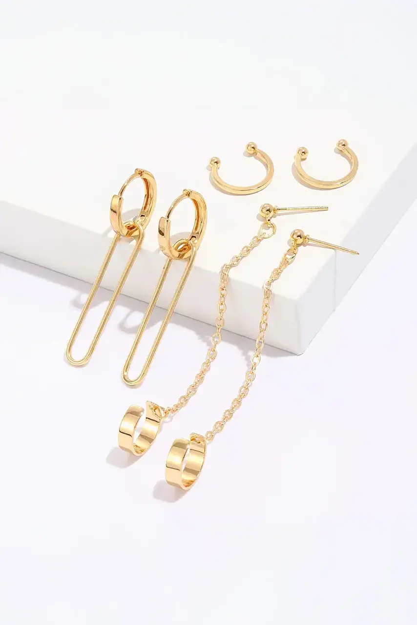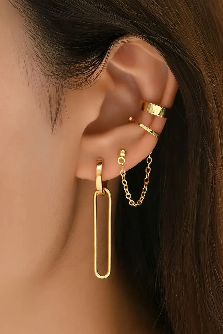 Σετ χρυσά σκουλαρίκια με αλυσίδα – το απόλυτο must για fashion-lovers με attitude. Το σετ περιλαμβάνει διαφορετικά σχέδια: από bold κρεμαστά σκουλαρίκια σε U-shape γραμμή, μέχρι λεπτά ear cuffs με αλυσίδα και studs, προσφέροντας πλήρη ελευθερία για μοντέρνο ear layering. Η χρυσή τους απόχρωση με 14K επίστρωση προσθέτει πολυτέλεια, ενώ το lightweight design τα καθιστά ιδανικά για all-day wear.