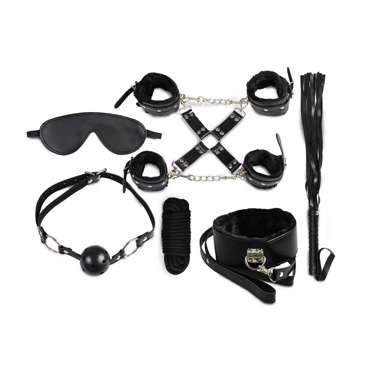 Ζήσε την απόλυτη εμπειρία υποταγής και ερωτικού ελέγχου με αυτό το ολοκληρωμένο σετ Bondage BDSM, σχεδιασμένο για ζευγάρια που θέλουν να εξερευνήσουν νέες απολαύσεις. Όλα τα εξαρτήματα είναι από συνθετικό δέρμα, σε απαλό μαύρο συνδυάζοντας αισθησιασμό, αντοχή και ασφάλεια.
