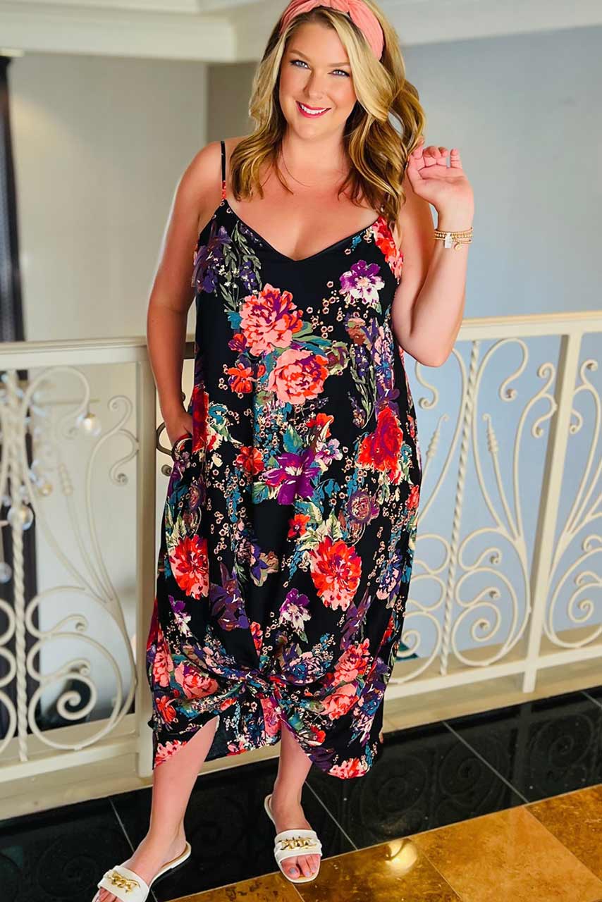 Φλοράλ μαύρο boho φόρεμα με spaghetti straps, που κολακεύει την κάθε σιλουέτα και επιμηκύνει τα πόδια. Διαθέσιμο σε μεγάλα μεγέθη, από XL έως 3XL και έχει κανονική γραμμή.