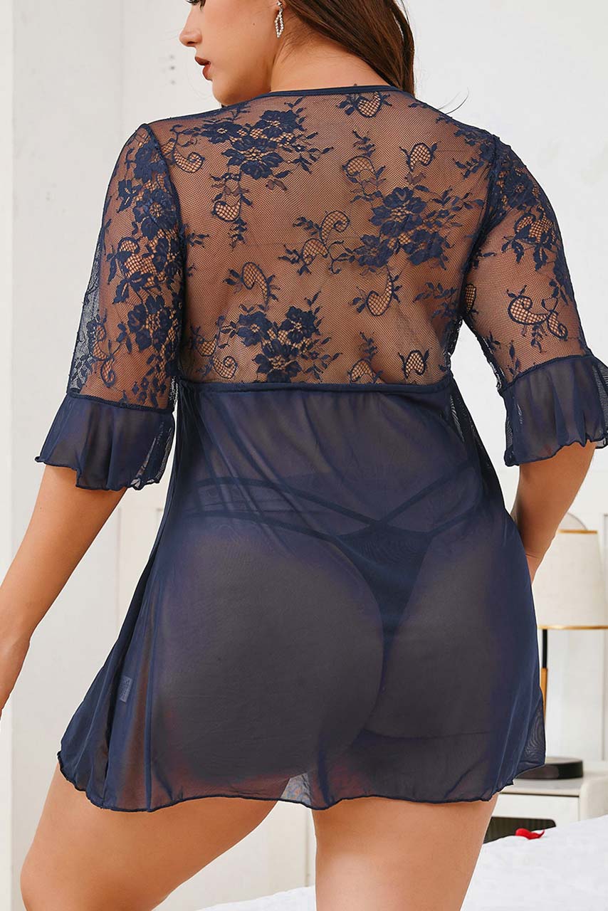 Νέο σέξι μπλέ plus size babydoll με λεπτομέρειες δαντέλας και διαφάνεια. Διαθέτει μανίκι 3/4 με κορδονάκι στην μέση που δένει και σλιπ στρίνγκ.