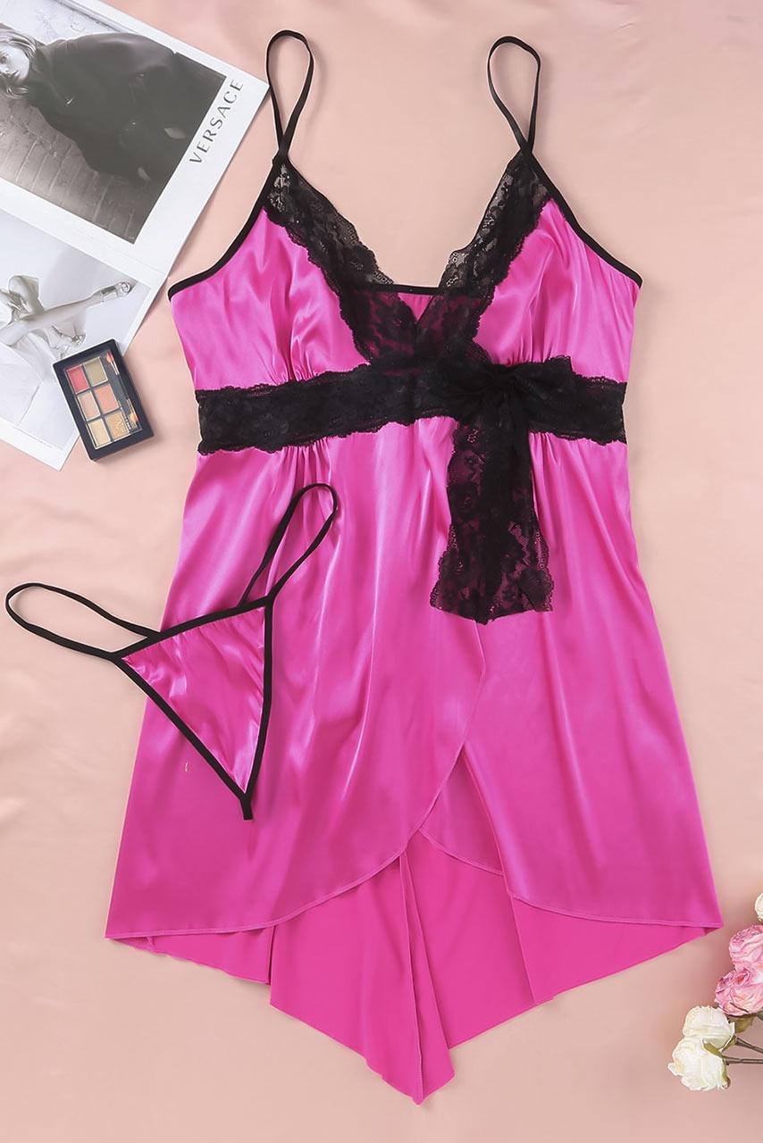 Ρομαντικό μίνι plus size satin νυχτικό babydoll με δέσιμο μπροστά, ασύμμετρο κόψιμο και ασορτί strappy thong σε φούξια έντονο χρώμα και μαύρη δαντέλα. Οι τιράντες είναι ρυθμιζόμενες, έχει επένδυση στο στήθος και βγαίνει από XL νουμεράκι μέχρι 5XL.