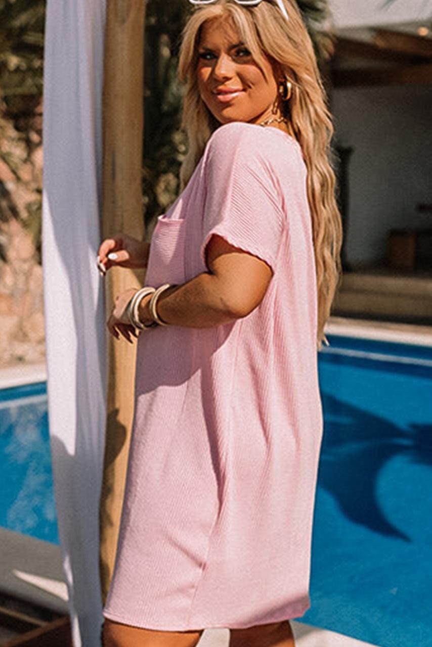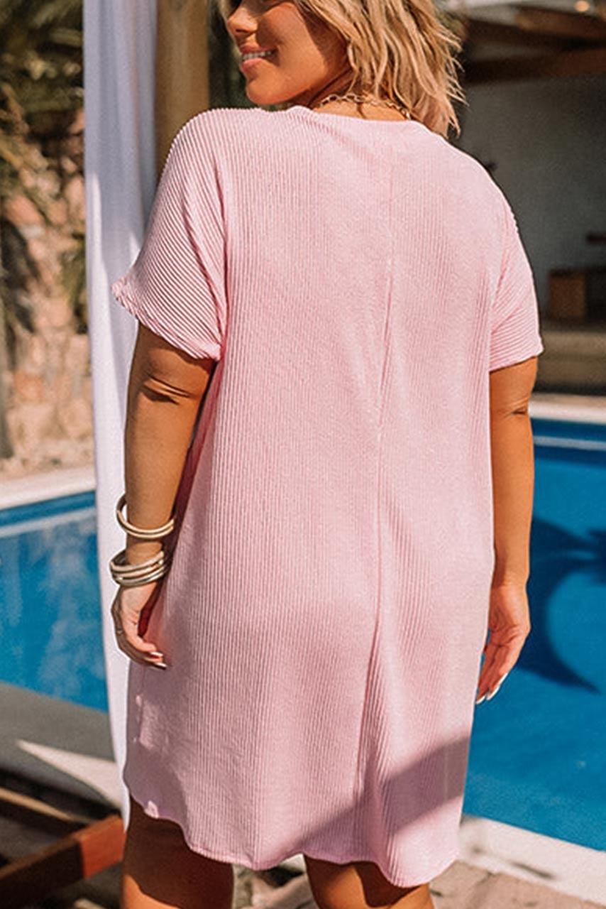Casual ribbed ροζ μίνι φόρεμα με τσέπη μπροστά. Είναι σε άνετη και χαλαρή γραμμή και βγαίνει από XL νουμεράκι μέχρι 3XL.