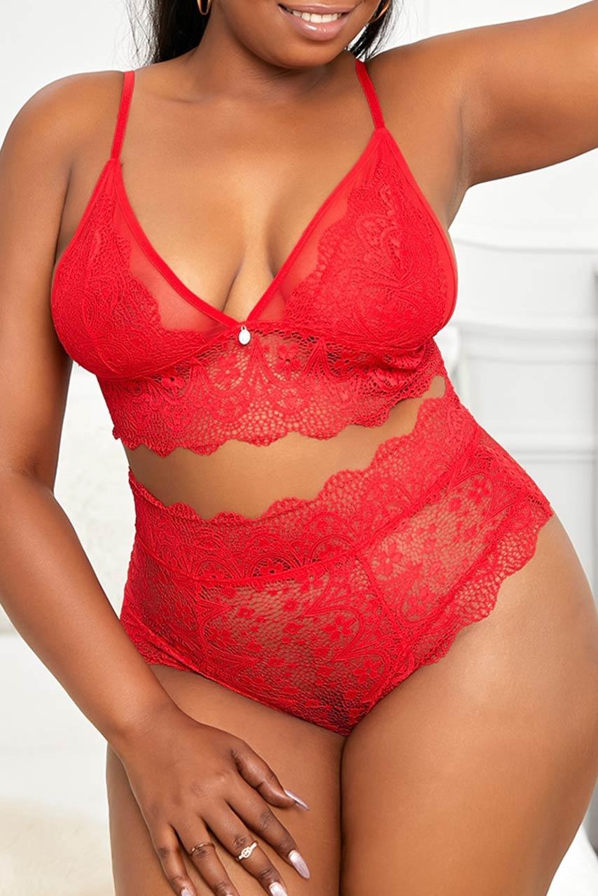 Corset style plus size σετ εσωρούχων σε κόκκινη απόχρωση με lace bustier με προσαρμοζόμενες τιράντες και ψηλόμεσο bottom με lace-up δέσιμο κορσέ στο πίσω μέρος.