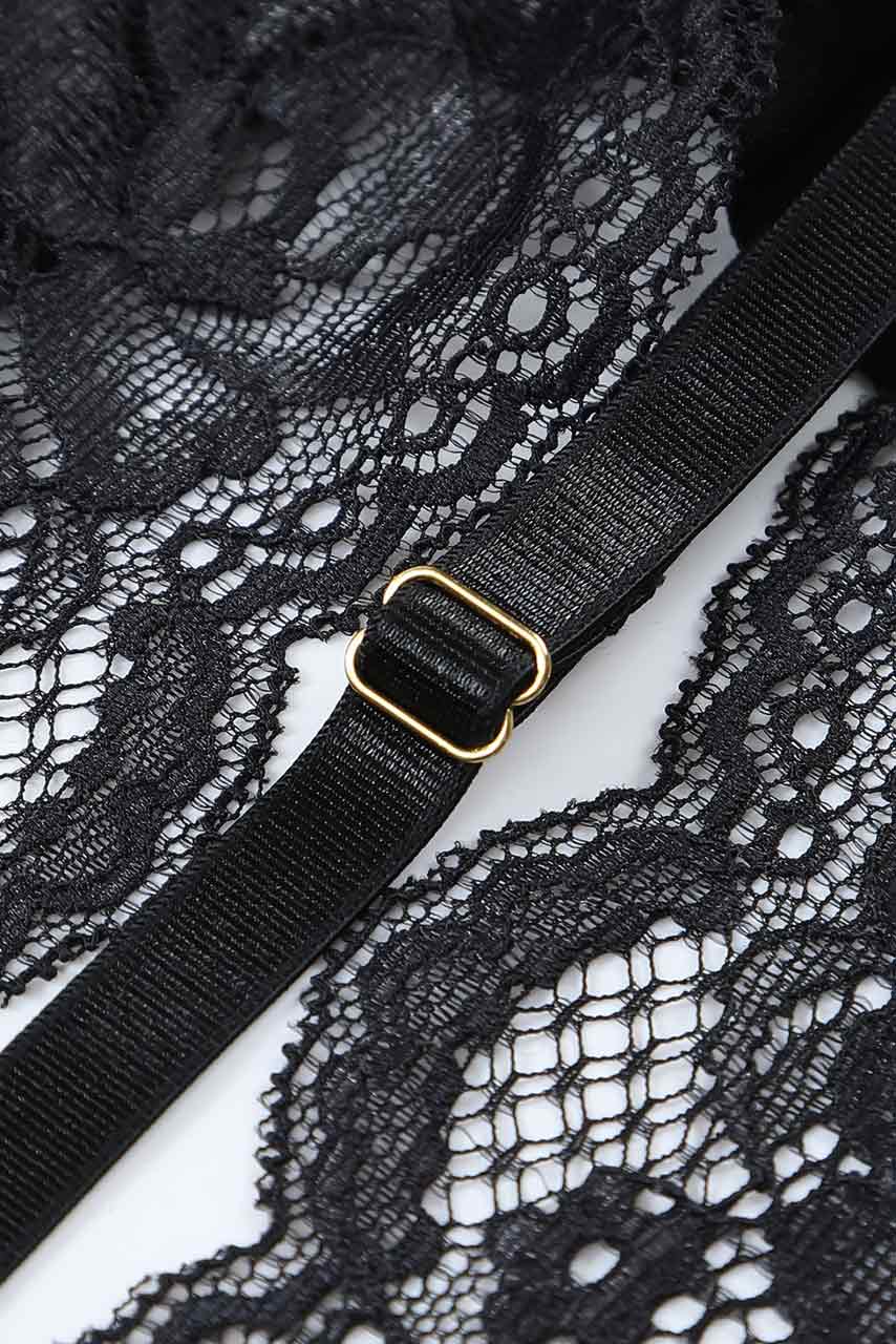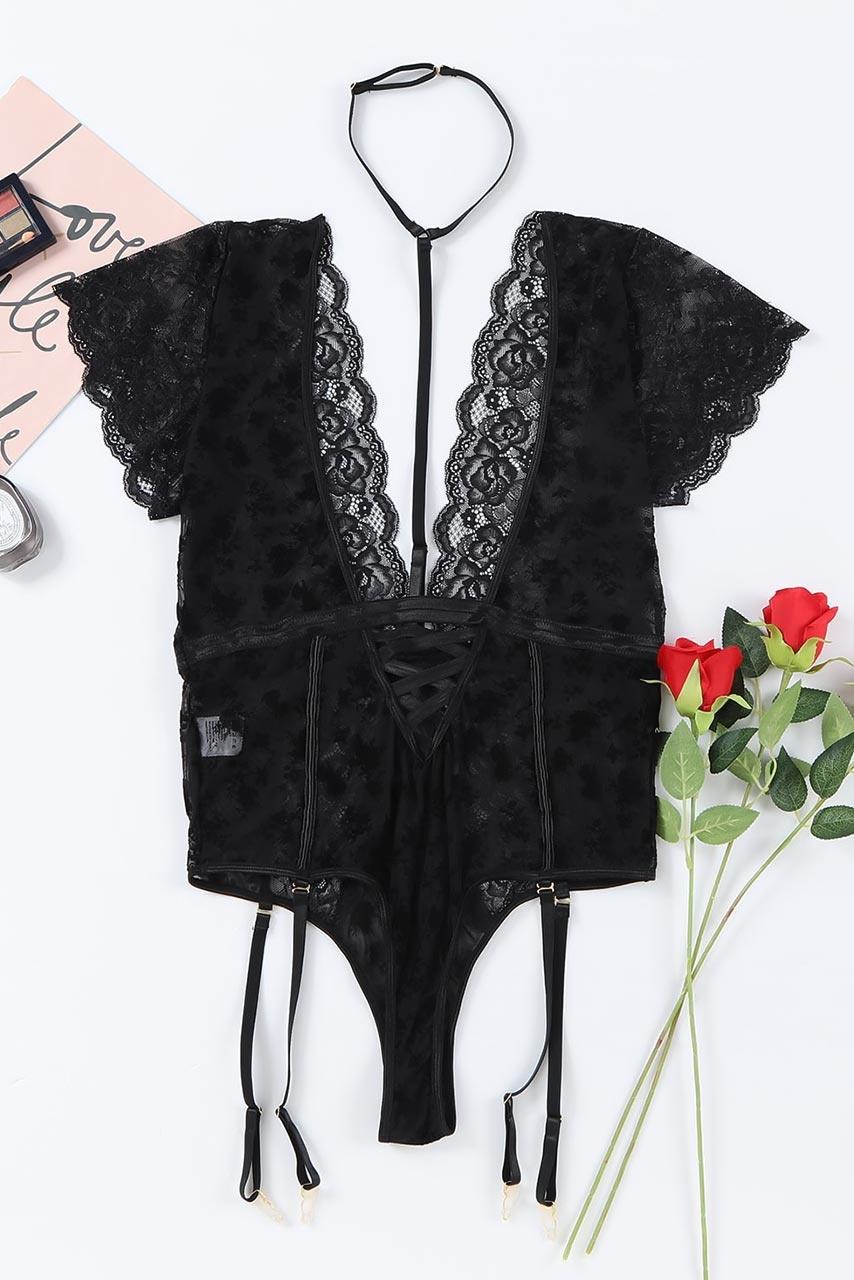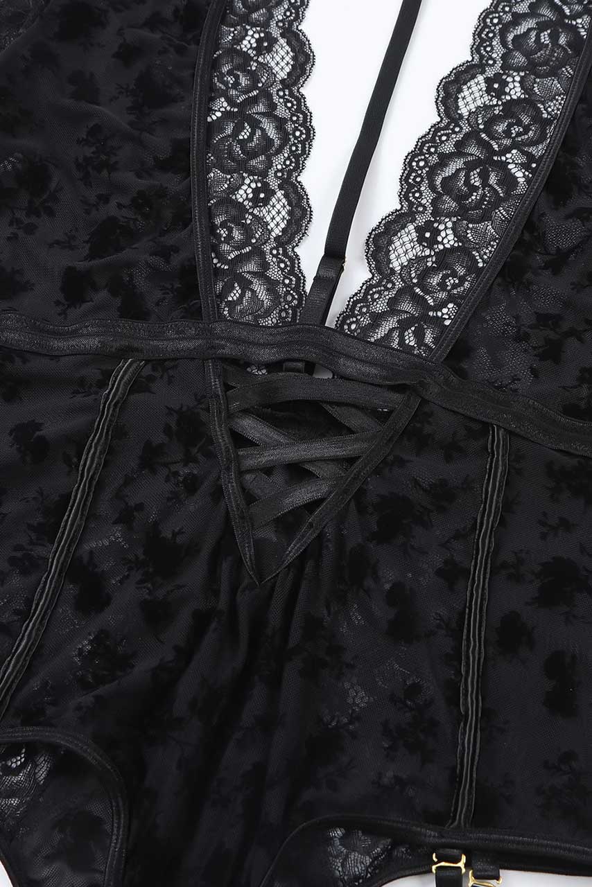 Mesh κορμάκι με ανοιχτή πλάτη, δαντέλα all over με criss cross και thong σλιπ με ενσωματωμένη ζαρτιέρα, για μοναδικές βραδινές εμφανίσεις.