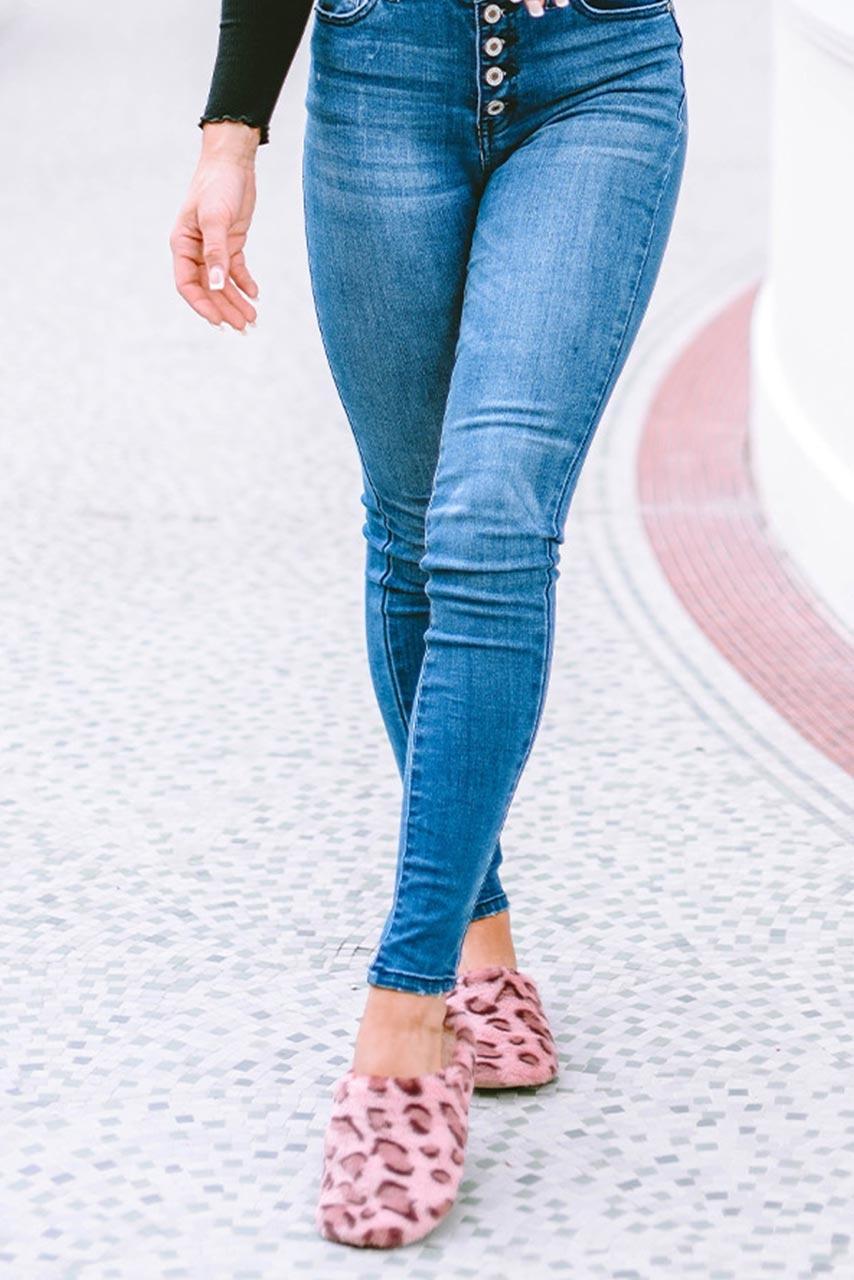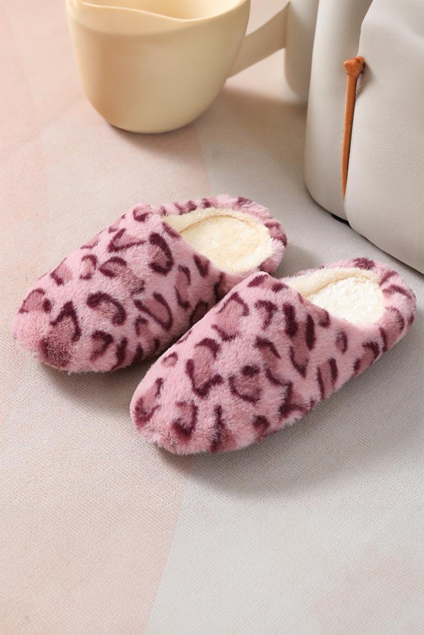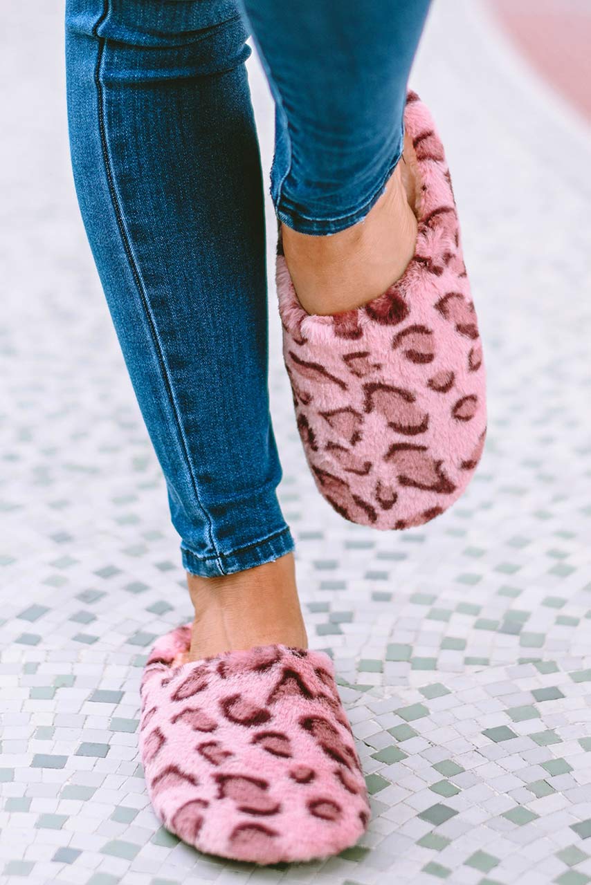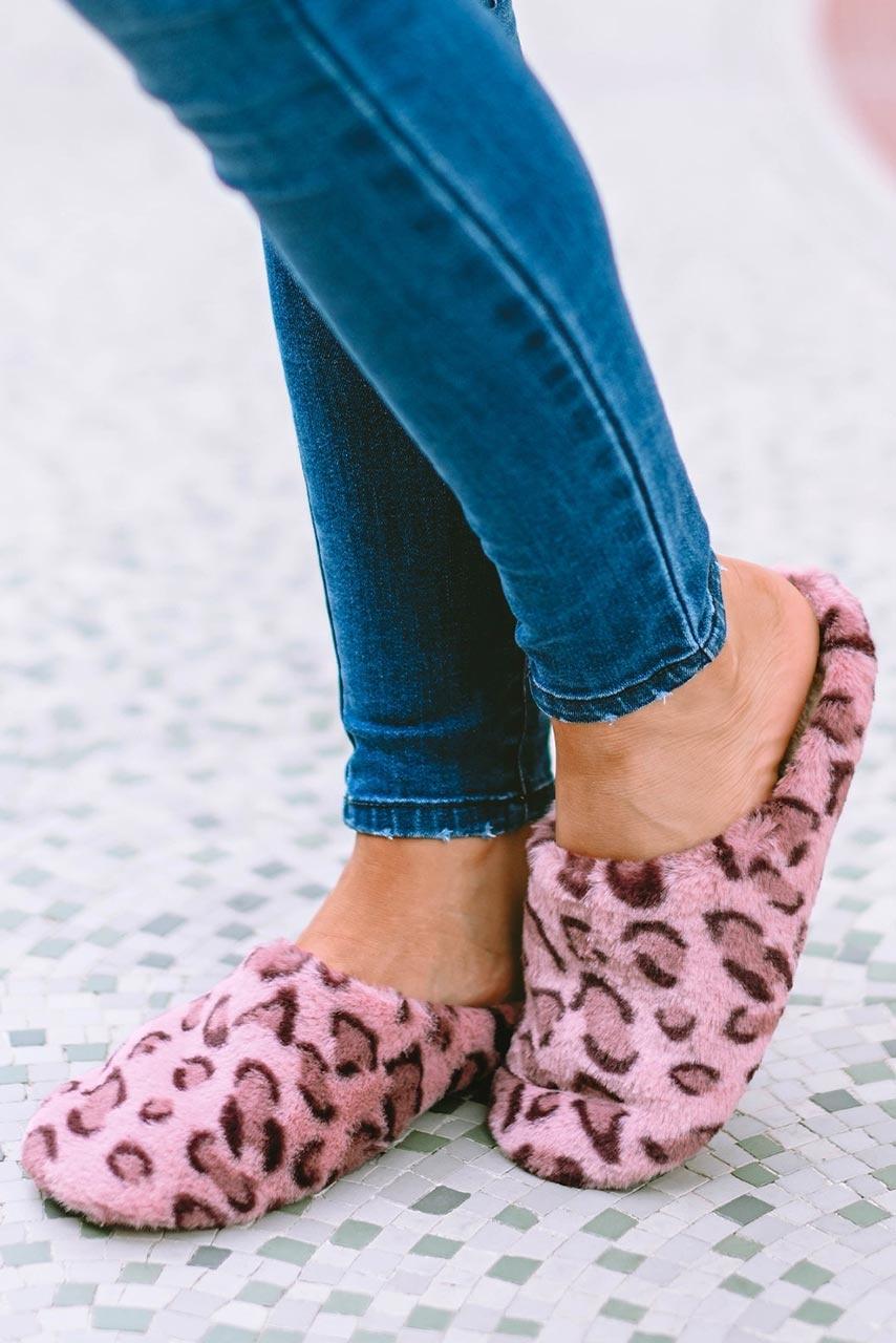 Άνετες ζεστές γούνινες παντόφλες σε leopard animal print σχέδιο.