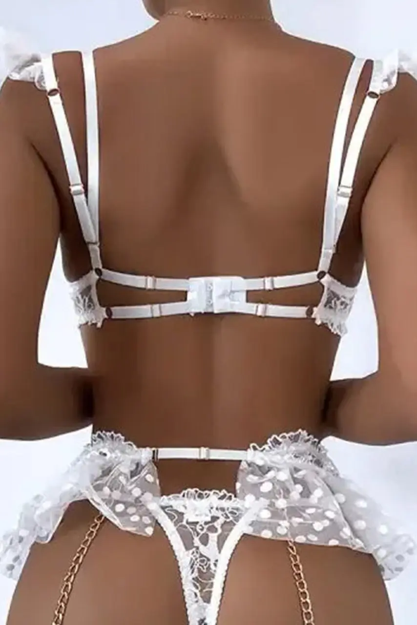 Είναι ρομαντικό. Είναι σέξι. Είναι απλώς ακαταμάχητο. Το sexy σετ με δαντέλα & καλτσοδέτες είναι φτιαγμένο για τις πιο ξεχωριστές σου στιγμές. Η λευκή δαντέλα αγκαλιάζει το σώμα απαλά, ενώ οι πουά τούλινες λεπτομέρειες στους ώμους και στους γοφούς προσθέτουν μια dreamy πινελιά.