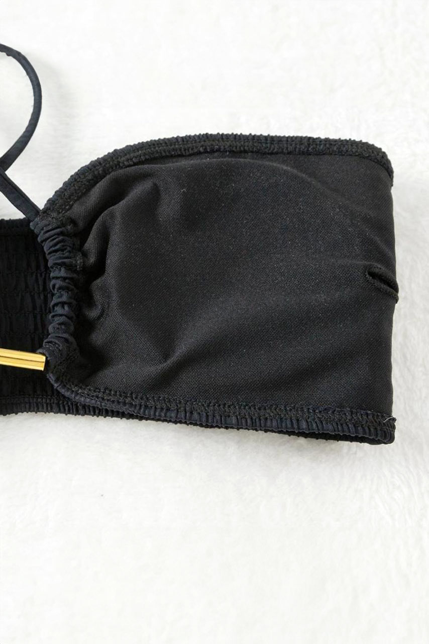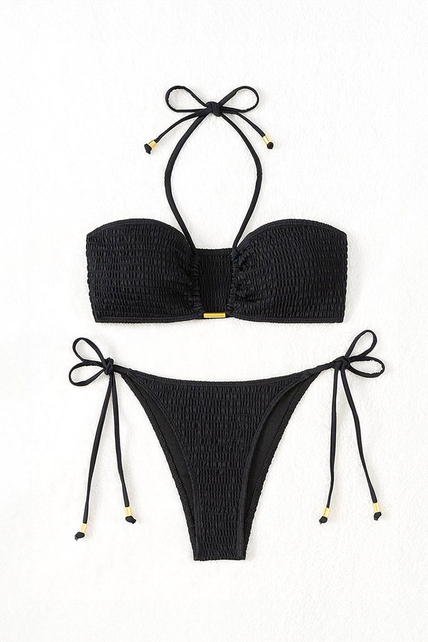 Glam μαύρο μπικίνι γκοφρέ μαγιό με άνοιγμα και μοναδική χρυσή metallic λεπτομέρεια μπροστά. Δένει πίσω από το λαιμό και το brazil σλιπ του έχει κορδονάκια με χρυσές λεπτομέρειες στο κάτω μέρος.