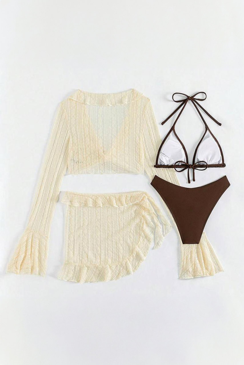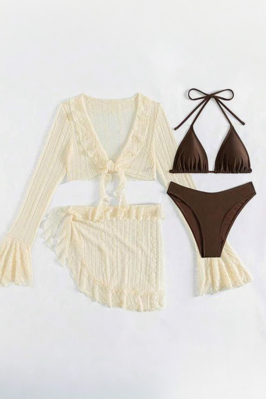 Σετ παραλίας με καφέ μπικίνι μαγιό και boho καφτάνι crop mesh με δέσιμο και βολάν.