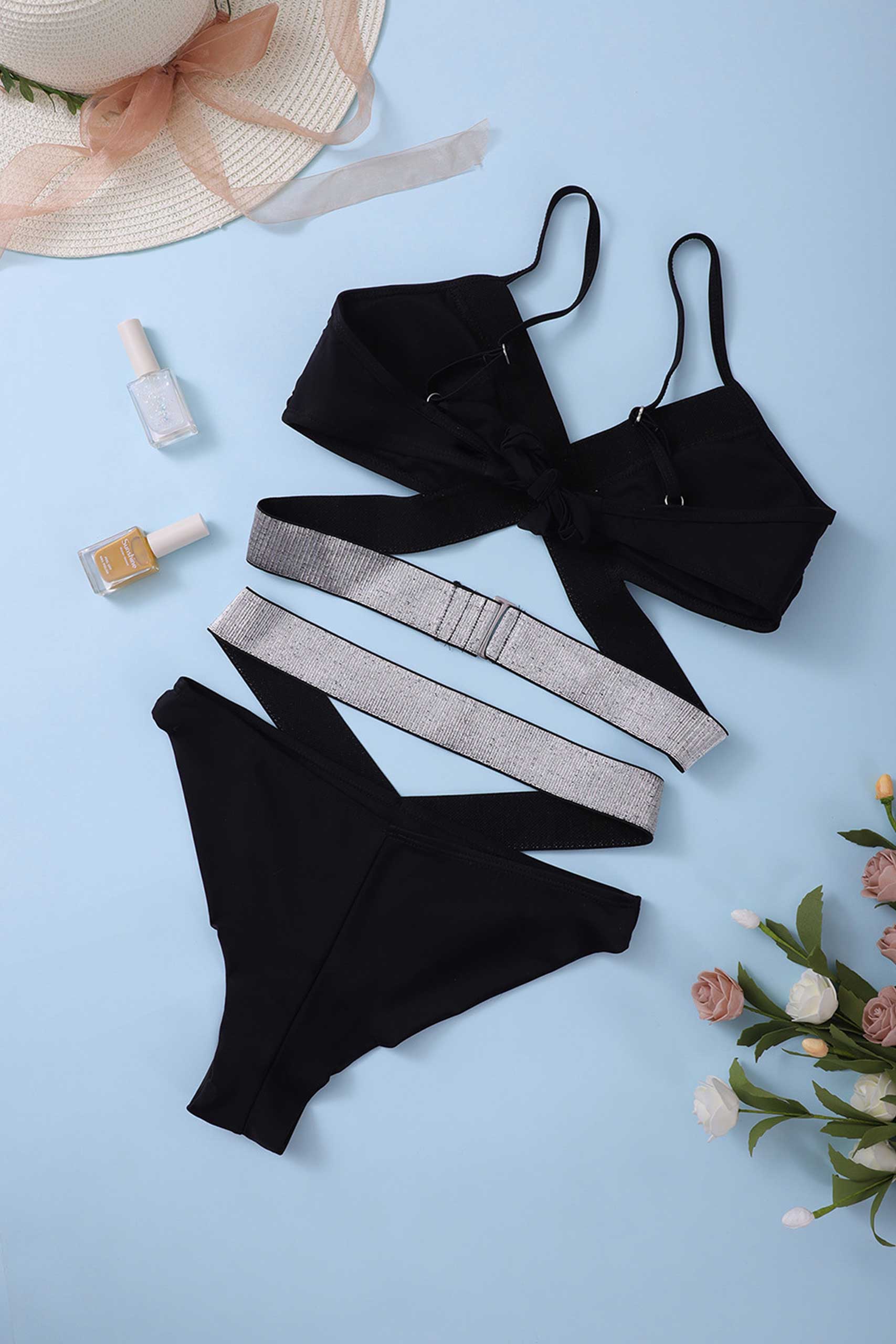 Glam n pop criss cross μπικίνι σε μαύρο χρώμα, με μεγάλα λάστιχα χιαστί περιμετρικά σε ασημί μεταλλική απόχρωση.