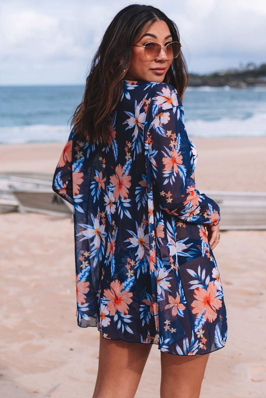 Boho 3-piece σετ παραλίας με push-up τριγωνάκι σε σκούρο μπλε φόντο και colourful tropical patterns, μαζί με ασορτί αέρινο καφτάνι τύπου κιμονό και φύγατε για την παραλία!