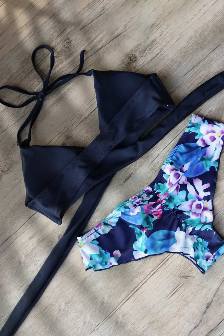 Κρις κρος μπικίνι με μπλε τοπ και φλοράλ σλιπ χωρίς ραφές.