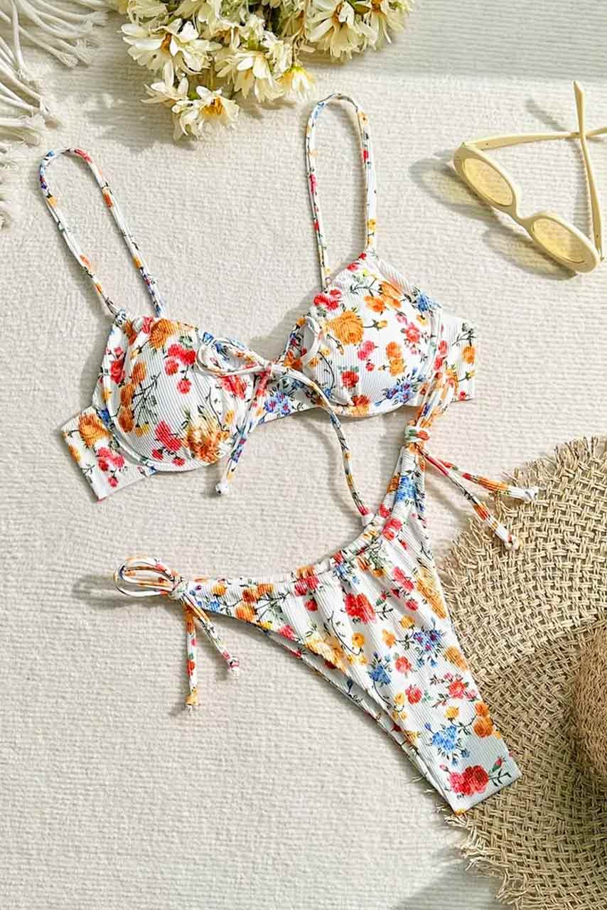 Ένα floral μπικίνι που αποπνέει απόλυτη θηλυκότητα και ρομαντική διάθεση. Σε λευκή βάση με απαλά λουλουδάτα μοτίβα, το συγκεκριμένο σετ είναι εμπνευσμένο από το boho chic στυλ, ιδανικό για ανέμελες καλοκαιρινές στιγμές. Το top με ρυθμιζόμενο κορδόνι στο κέντρο προσφέρει τέλεια εφαρμογή και στυλ, ενώ τα κορδόνια στο κάτω μέρος χαρίζουν άνεση και δυνατότητα προσαρμογής.