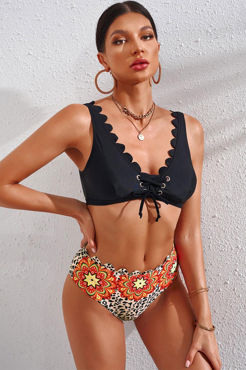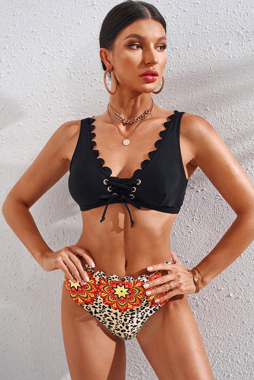 Modern classic leopard μπικίνι με δύο μοτίβα, μονόχρωμο bra top και leopard ψηλόμεσο σλιπ με laser cut τελείωμα.