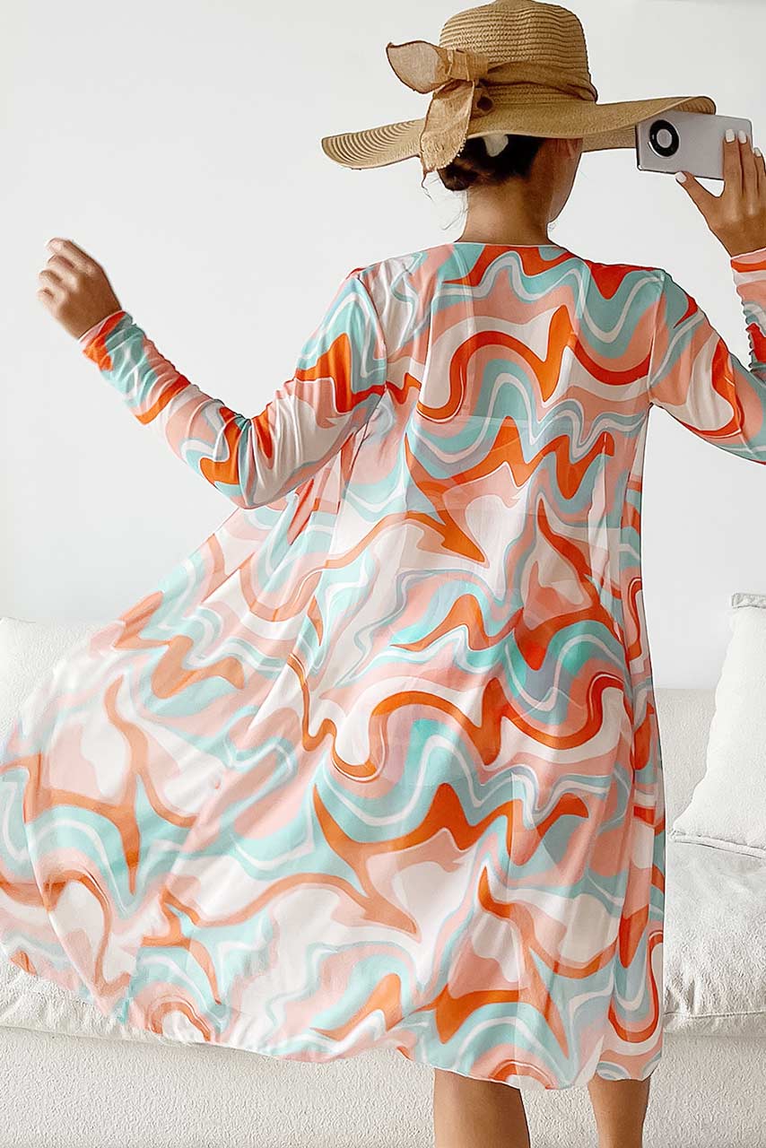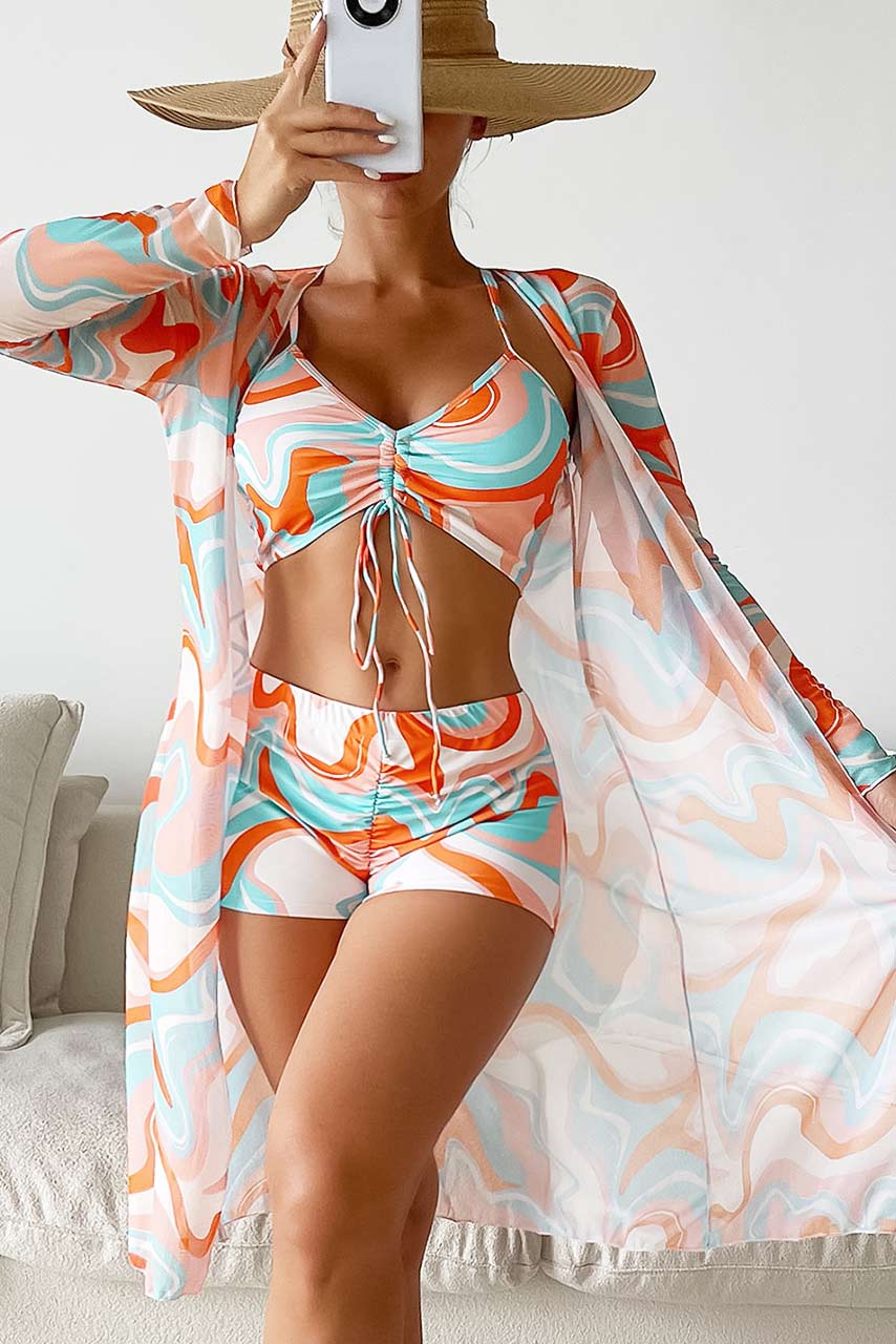 Μοναδικό funky 3piece μπικίνι σε abstract print με μακρυμάνικο καφτάνι. Έχει bikini top μπουστάκι με σούρες και κορδόνια που προσαρμόζονται στο στήθος και άνετο ψηλόμεσο boy shorts σλιπ που θα σας συνοδεύει ώρες στην παραλία.