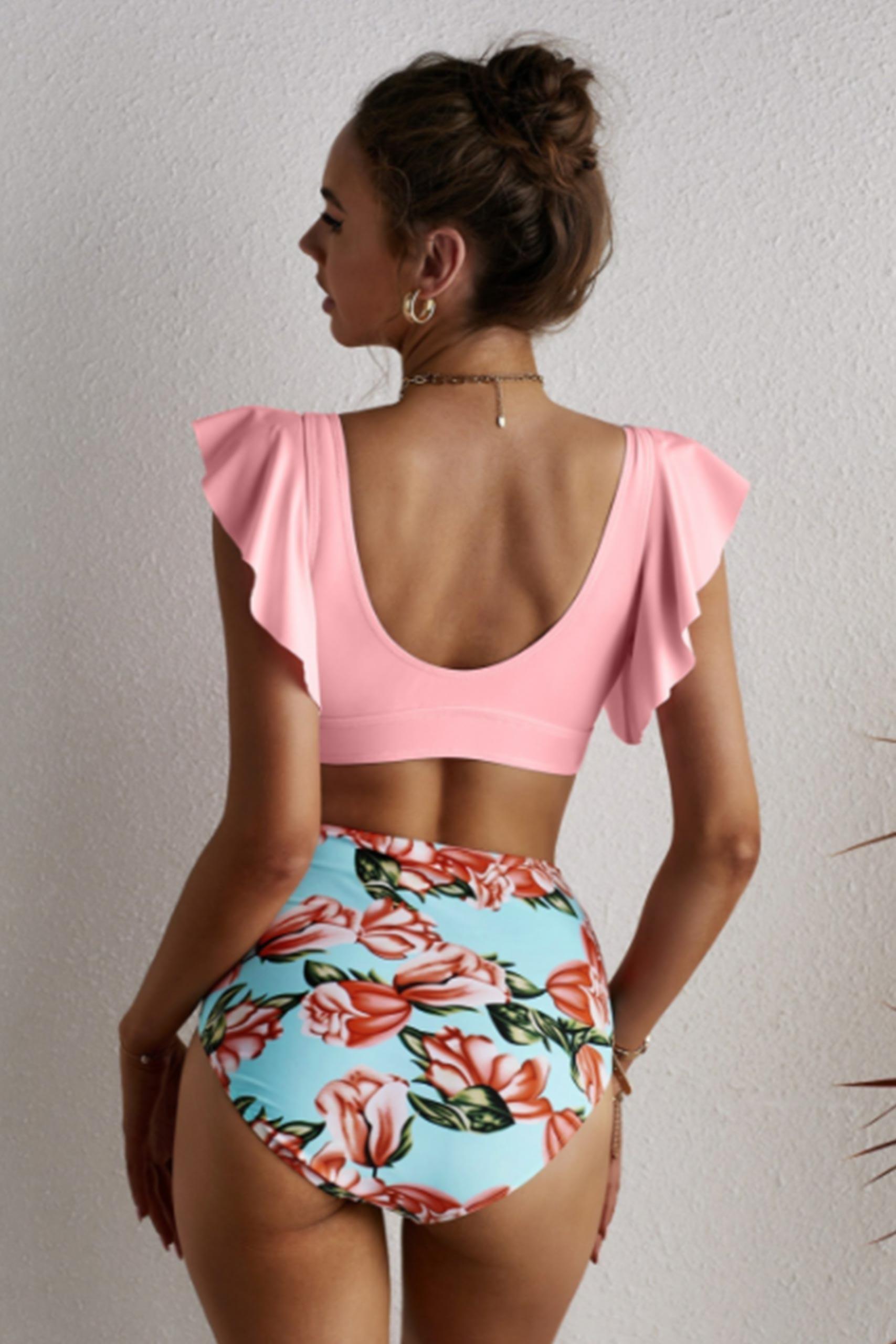 Exotic ροζ μαγιό μπικίνι με crop top με βολάν και ψηλόμεσο floral bottom.