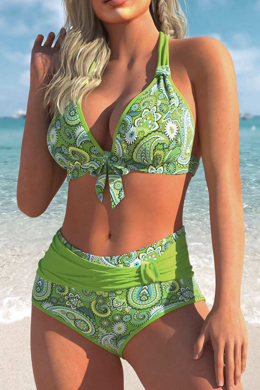 Αν είσαι λάτρης του πράσινου αυτό το halter neck μπικίνι θα γίνει το αγαπημένο σου. Άν δεν είσαι λάτρης του πράσινου πάλι, με αυτό το μαγιό θα γίνεις. Είναι ψηλόμεσο και σε μια υπέροχη απόχρωση του πράσινου με λαχούρια σε πιό ανοιχτόχρωμους συνδυασμούς και διακοσμητική ζώνη στο κάτω μέρος. Το πάνω μέρος έχει μοναδική γραμμή και πολύ κομψή εφαρμογή.