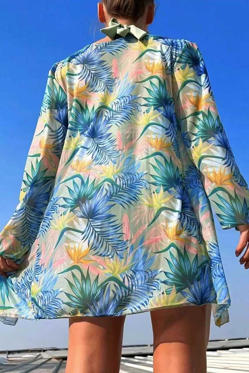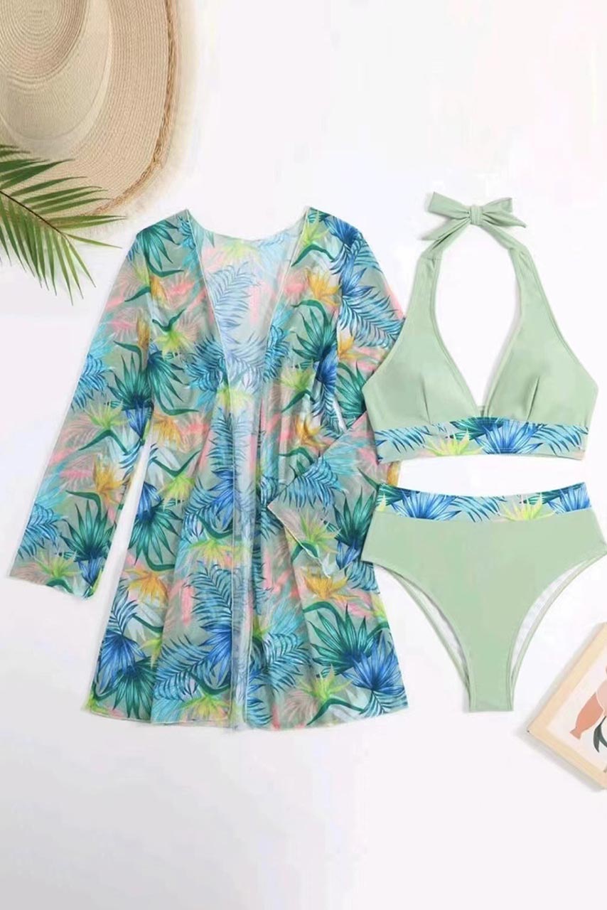 3-pieces σετ παραλίας με halter neck μπικίνι σε καλοκαιρινή απόχρωση και tropical pattern, μαζί με ασορτί αέρινο καφτάνι τύπου κιμονό και φύγατε για την παραλία!