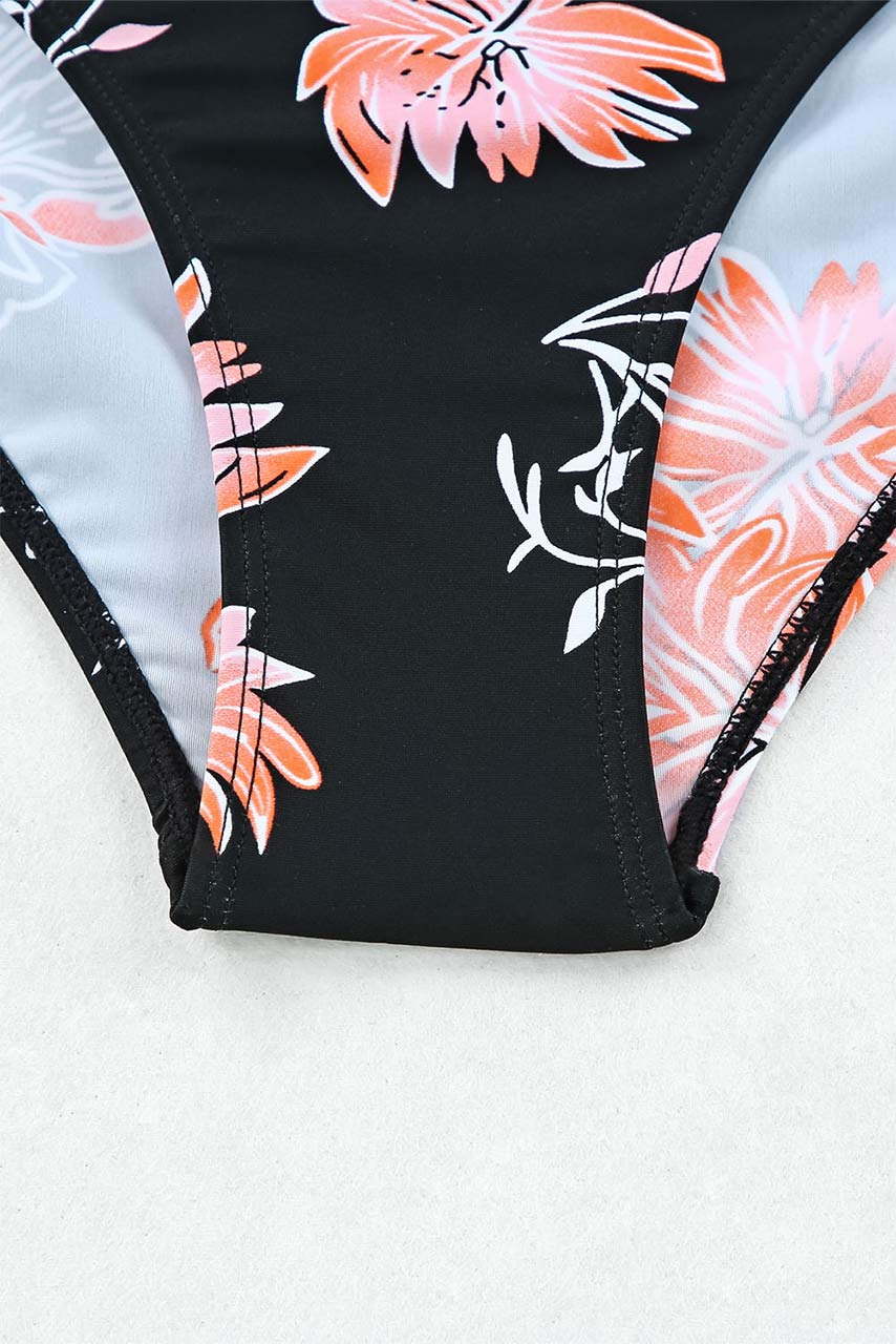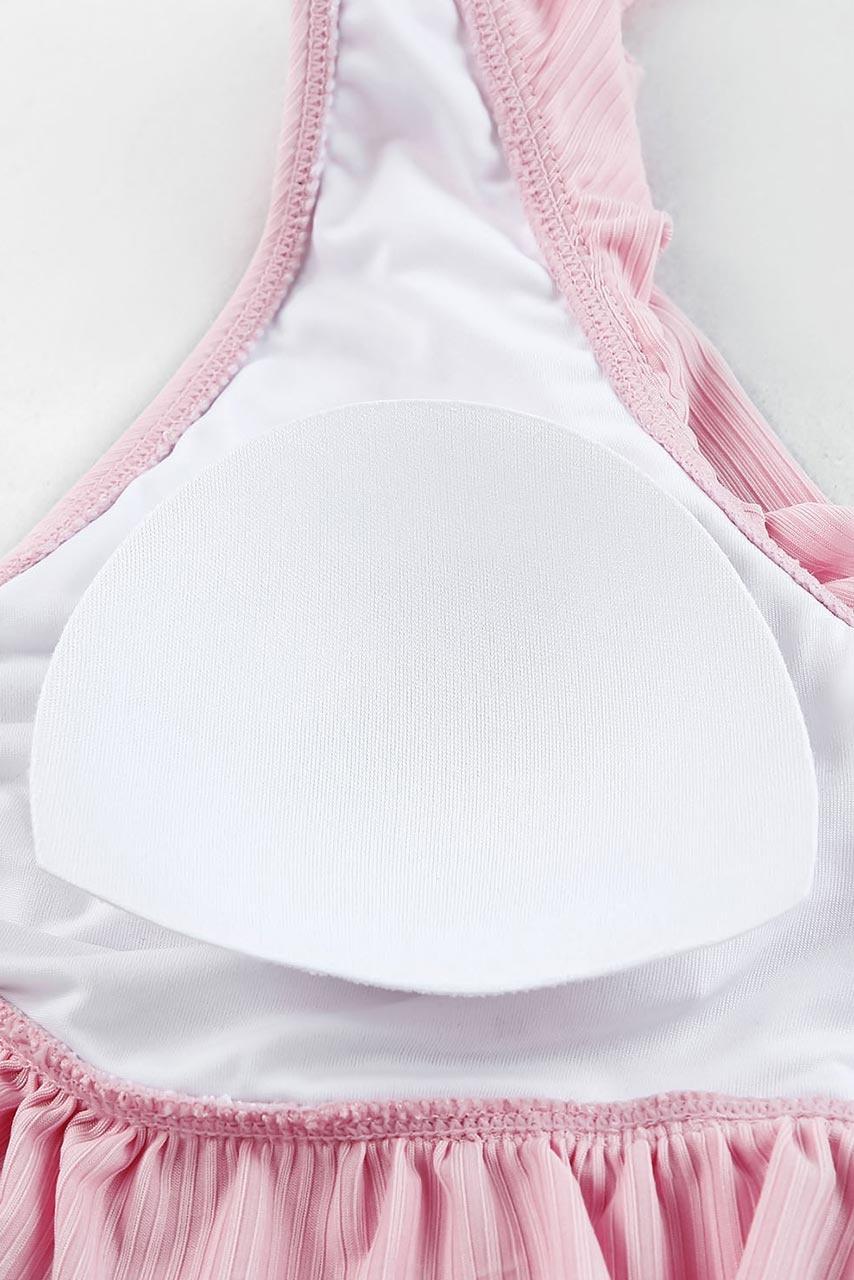 Ψηλόμεσο μπικίνι printed με φλοραλ pattern και ροζ μπουστάκι με όμορφα βολάν και σούρες μπροστά. Έχει normal cut σλιπ, μπουστάκι με μικρή ενίσχυση και front tie δέσιμο στο σλιπ.
