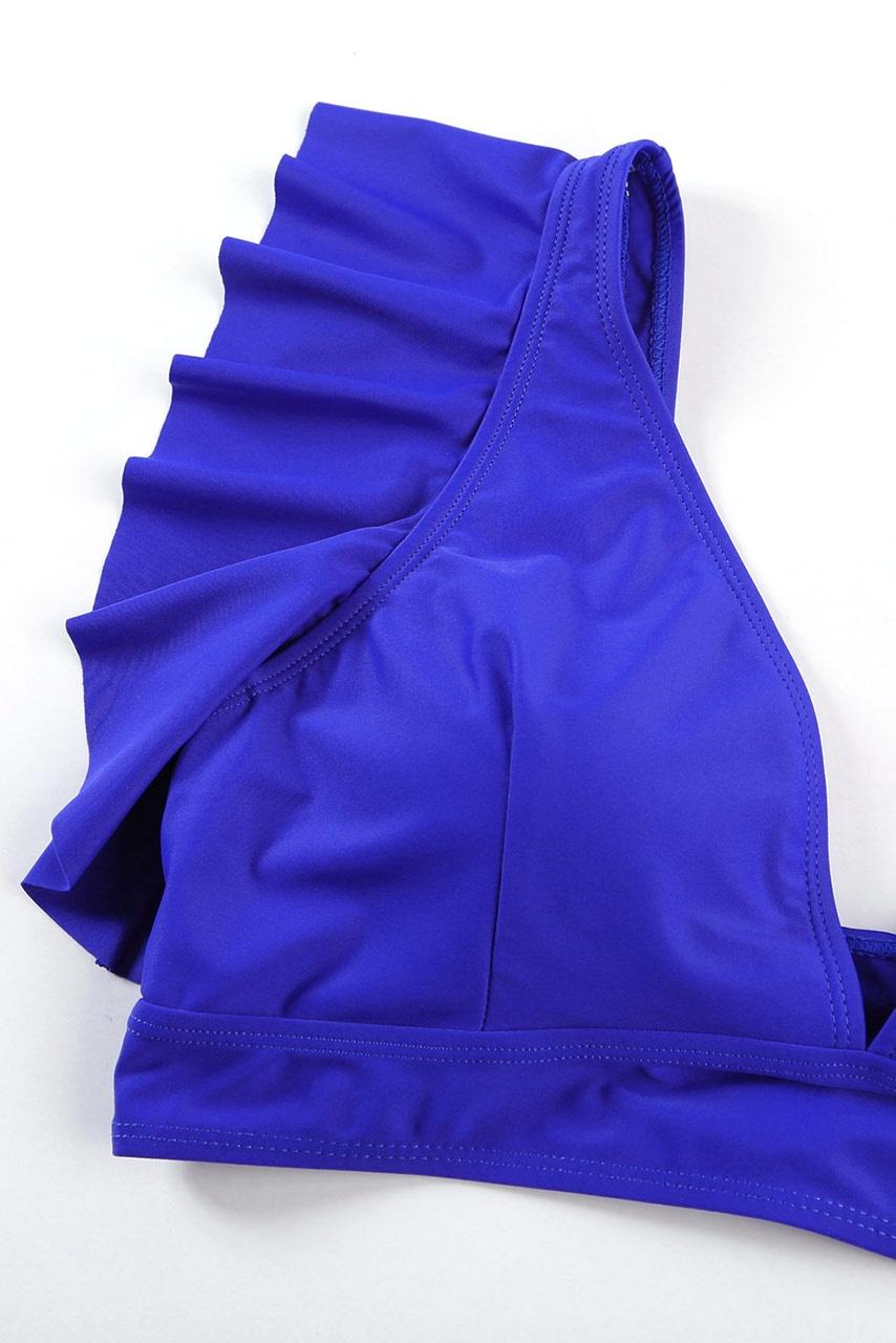 Φλοραλ tropical μπικίνι με μπουστάκι με μανίκια μεγάλους φραμπαλάδες on top σε μπλε απόχρωση και ψηλόμεσο colourful σλιπ.