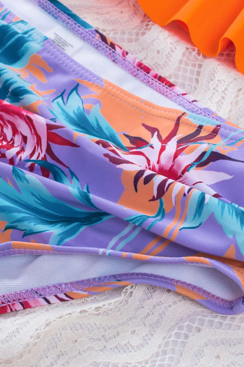 Φλοραλ tropical μπικίνι με μπουστάκι με μεγάλους φραμπαλάδες on bottom σε πορτοκαλί απόχρωση και colourful ψηλόμεσο σλιπ.