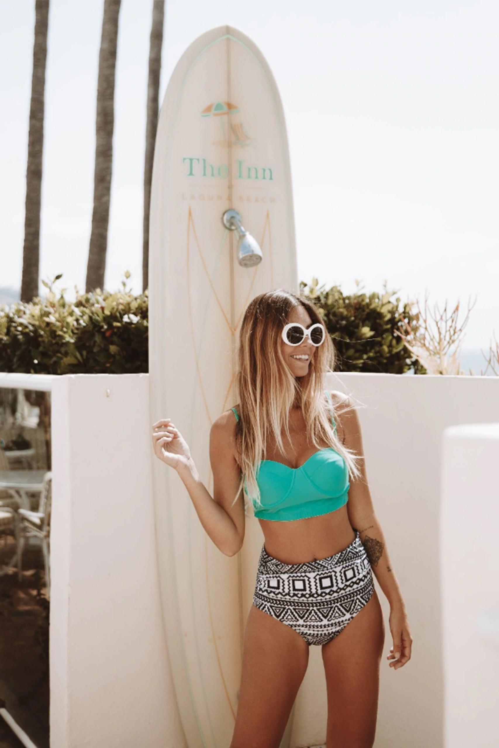 Δίχρωμο μαγιό δύο κομματιών με φλούο μπουστάκι on top και εμπριμέ ασπρόμαυρο ψηλόμεσο σλιπ.