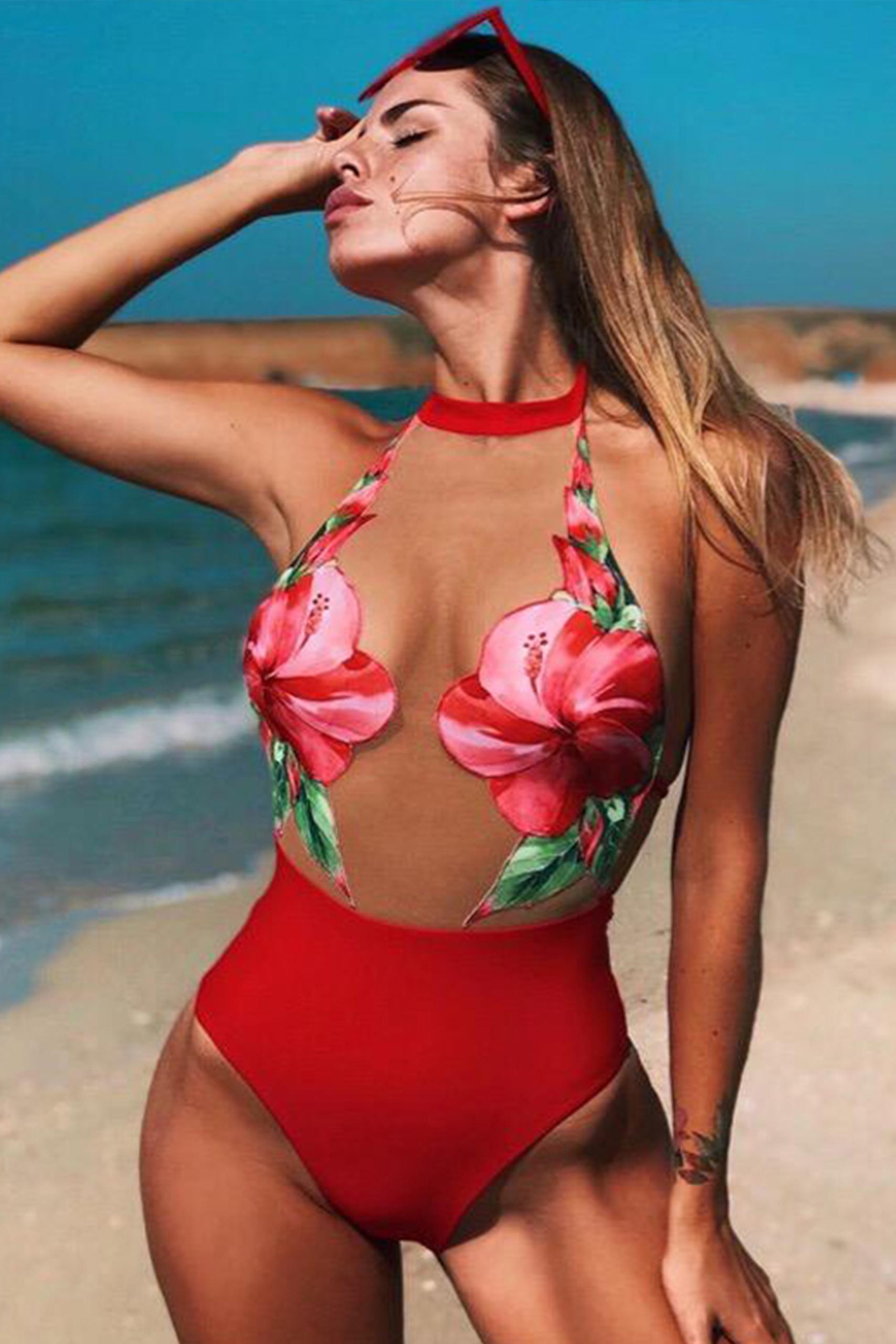Κόκκινο ολόσωμο με mesh διαφάνεια και patches λουλουδιών στο στήθος.