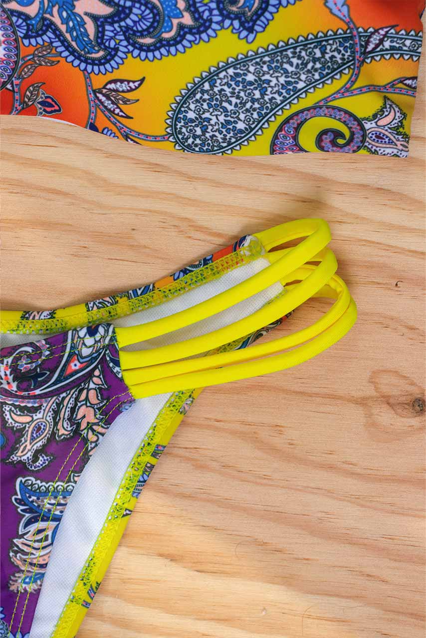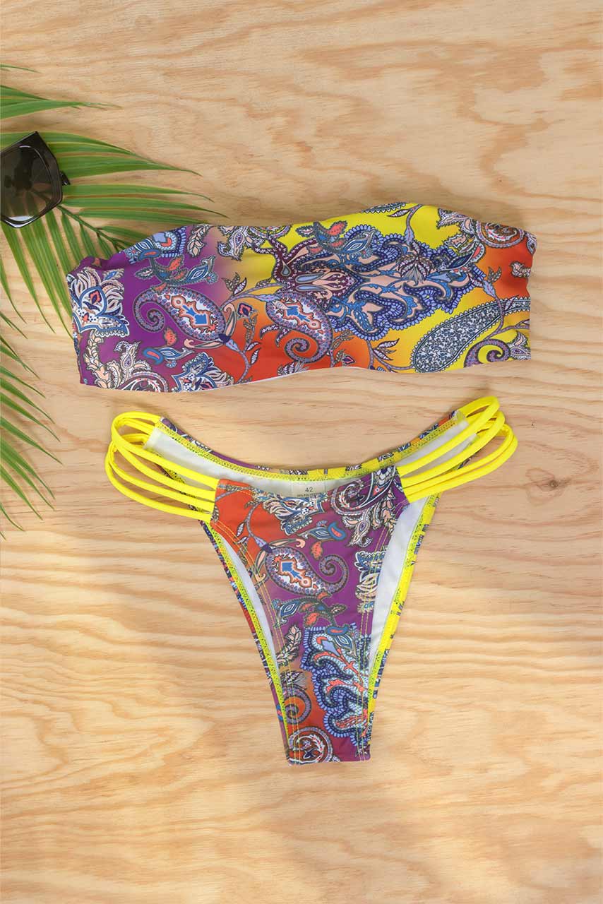 Strapless μπικίνι με boho διάθεση σε όμορφο εμπριμέ paisley pattern και λεπτομέρεια με κορδόνια στο σλιπ.