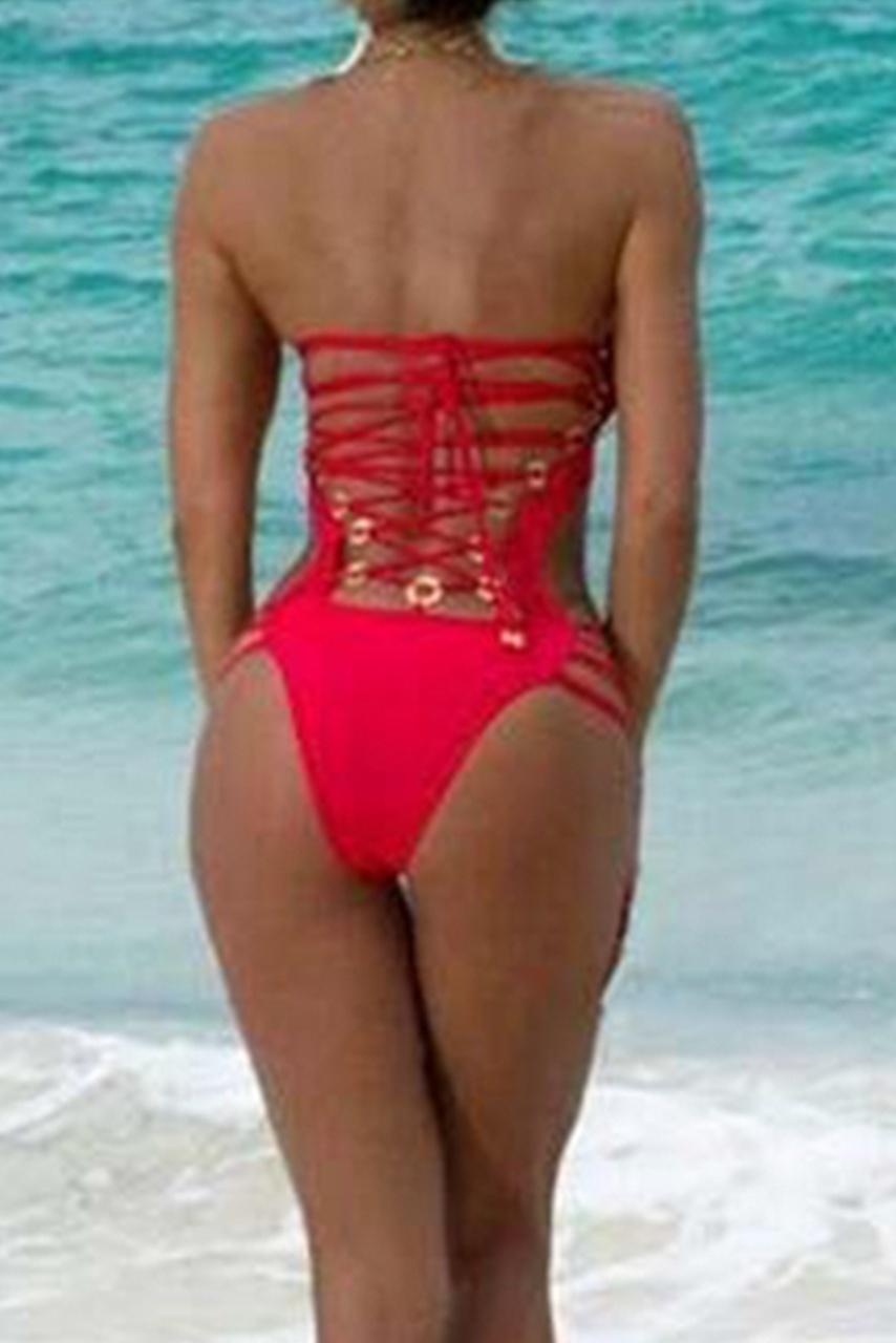 Στράπλες lace up ολόσωμο μαγιό με κορδόνια και χρυσούς κρίκους σε κόκκινο χρώμα.