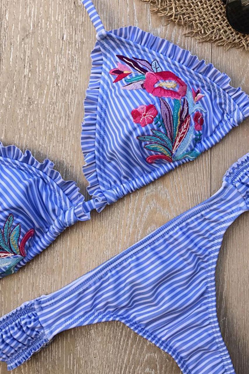 Η παραγγελία σου αποστέλλεται σε ουδέτερη, μη διαφανή συσκευασία, χωρίς ενδείξεις περιεχομένου. Μόνο εσύ γνωρίζεις τι περιλαμβάνει, με απόλυτο σεβασμό στην ιδιωτικότητά σου.Girly μπικίνι σε γαλάζιο χρώμα με ριγέ pattern και διακοσμητικά κεντητά λουλούδια στο τοπ. Διακριτικές λεπτομέρειες φραμπαλά περιμετρικά. Στενή εφαρμογή