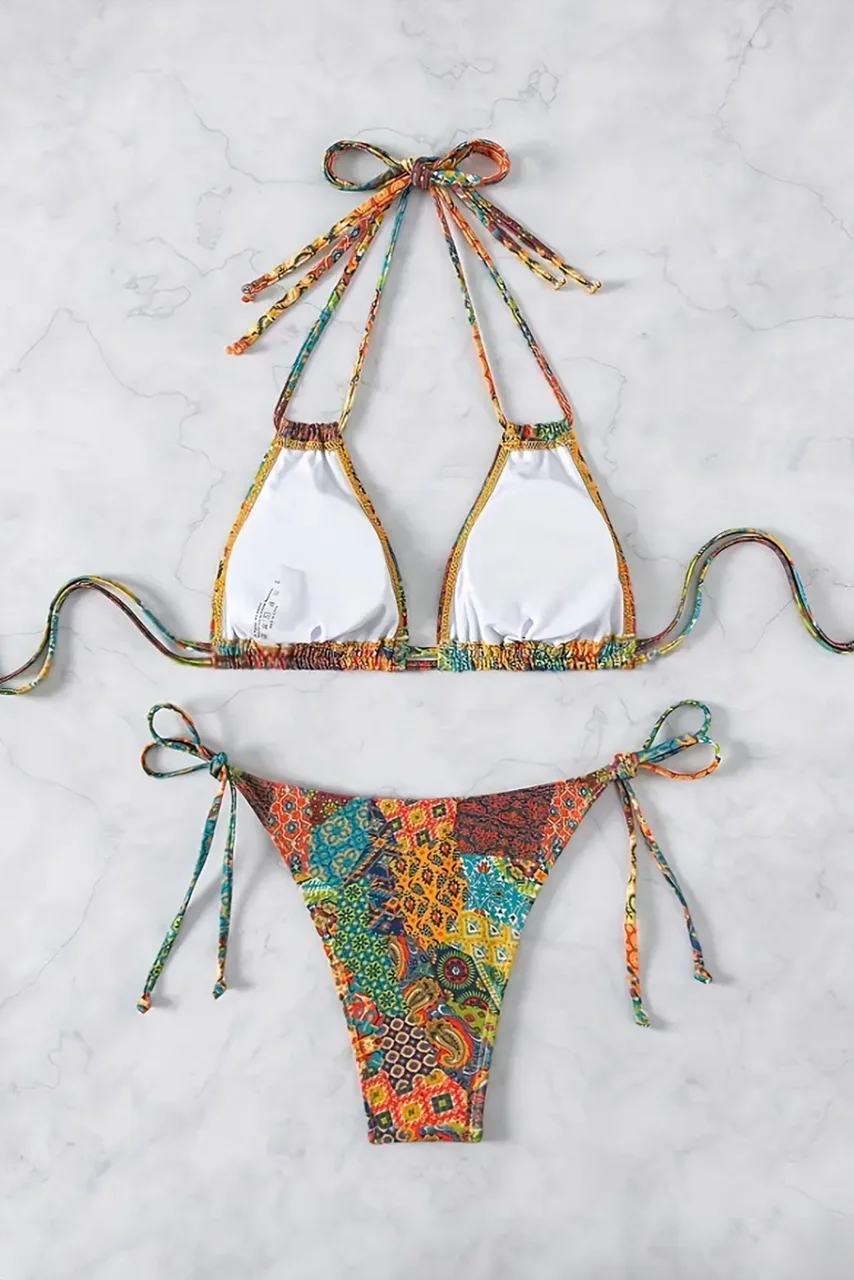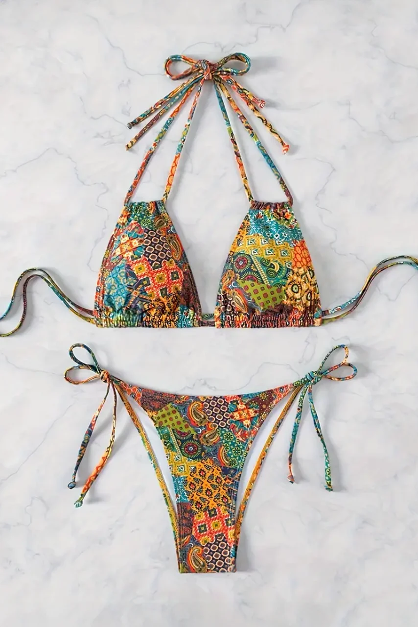 Μπικίνι πολύχρωμο με boho μοτίβο και κορδονάκια