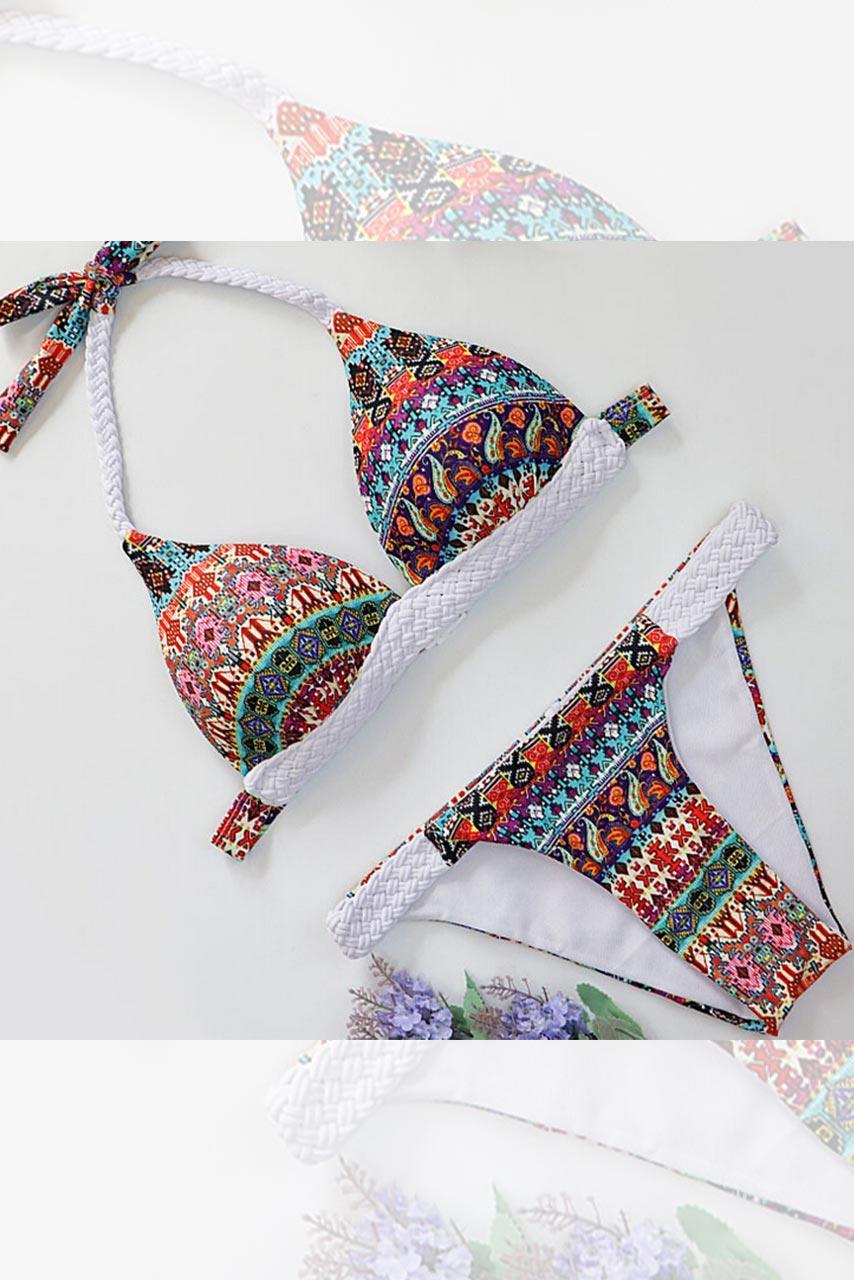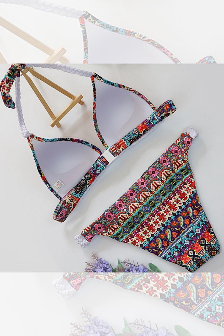 Πολύχρωμο τριγωνάκι με γεωμετρικές λεπτομέρειες και λευκά λάστιχα στο σουτιέν και στο σλιπ.