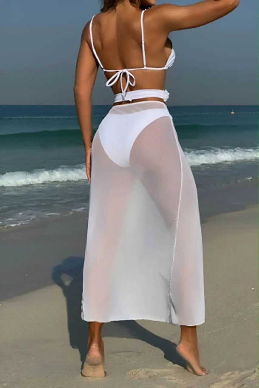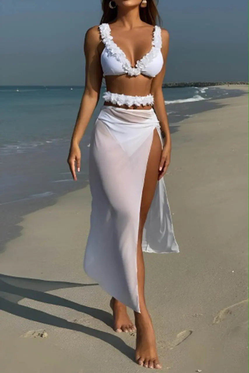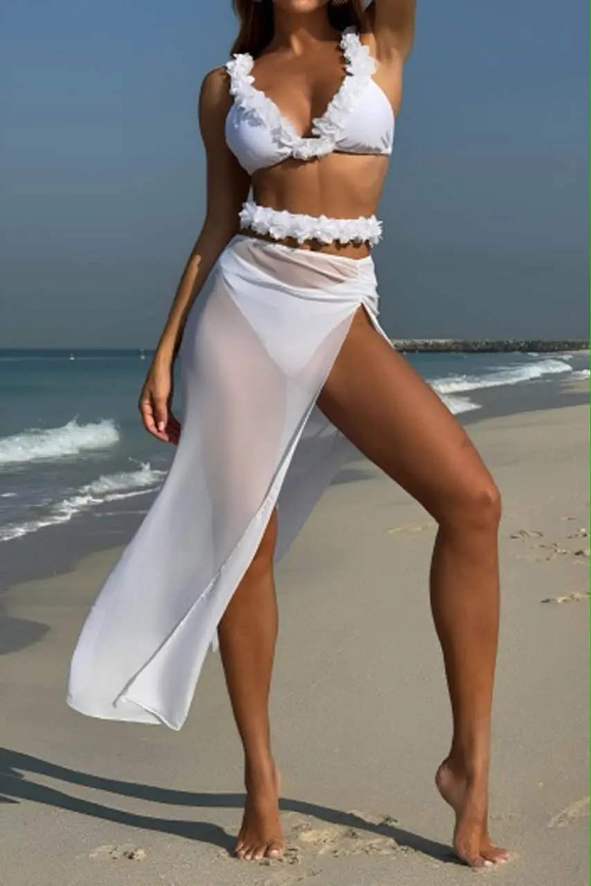 Αέρινη φινέτσα και bridal αισθητική στην πιο ρομαντική εκδοχή του καλοκαιριού. Το λευκό σετ μπικίνι με 3D λουλούδια και ημιδιάφανη φούστα είναι σχεδιασμένο για εμφανίσεις που μαγνητίζουν τα βλέμματα. Το top διαθέτει τριγωνικό κόψιμο με ανάγλυφα petals, ενώ η ζώνη στη μέση δένει παιχνιδιάρικα το look.